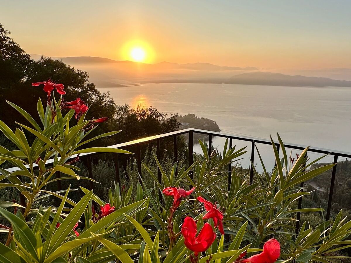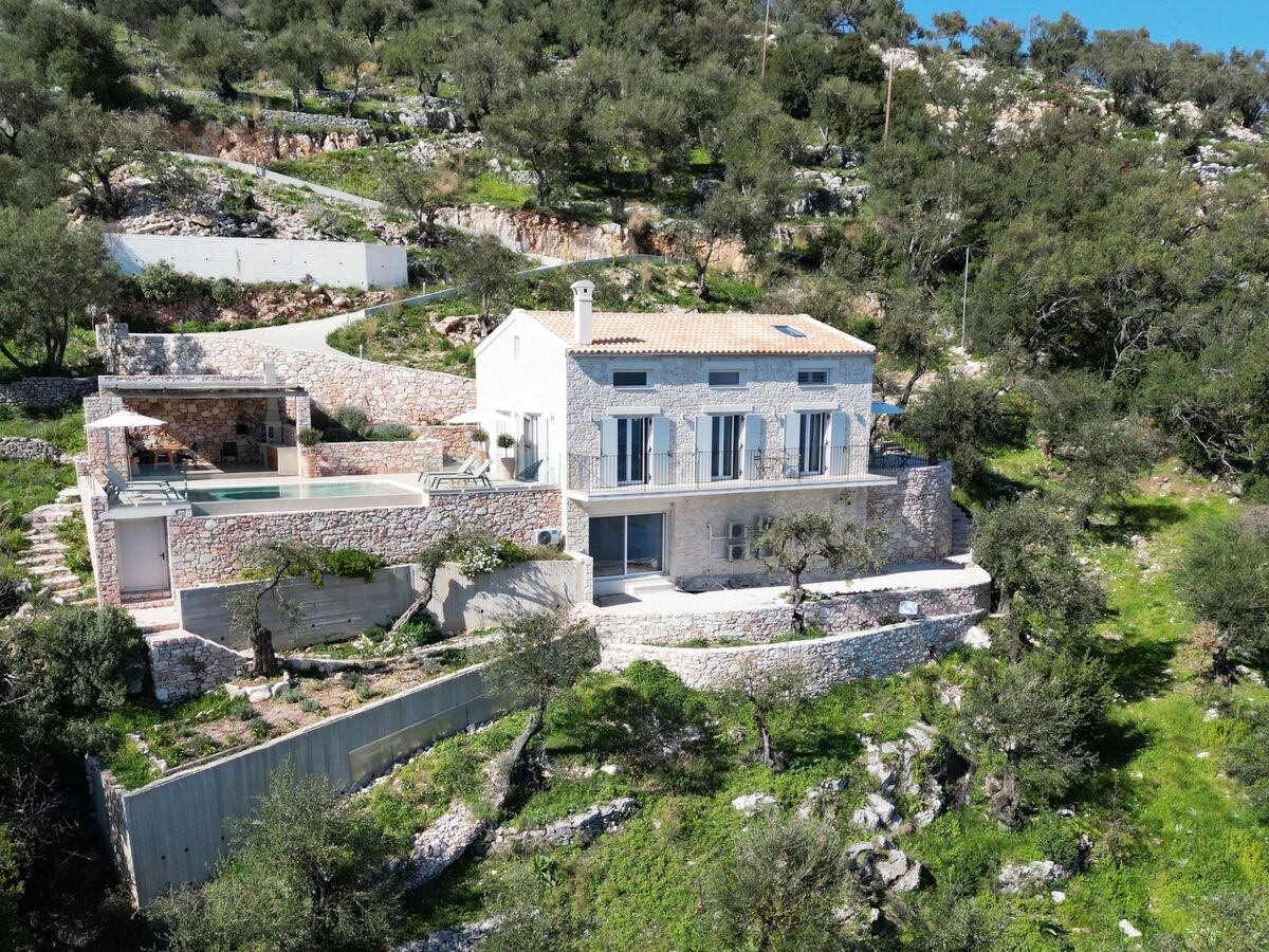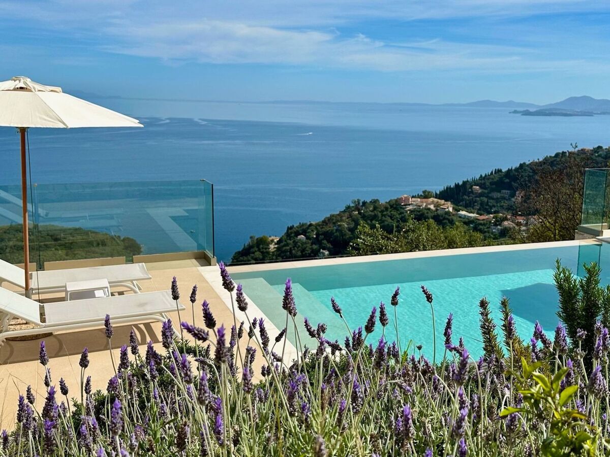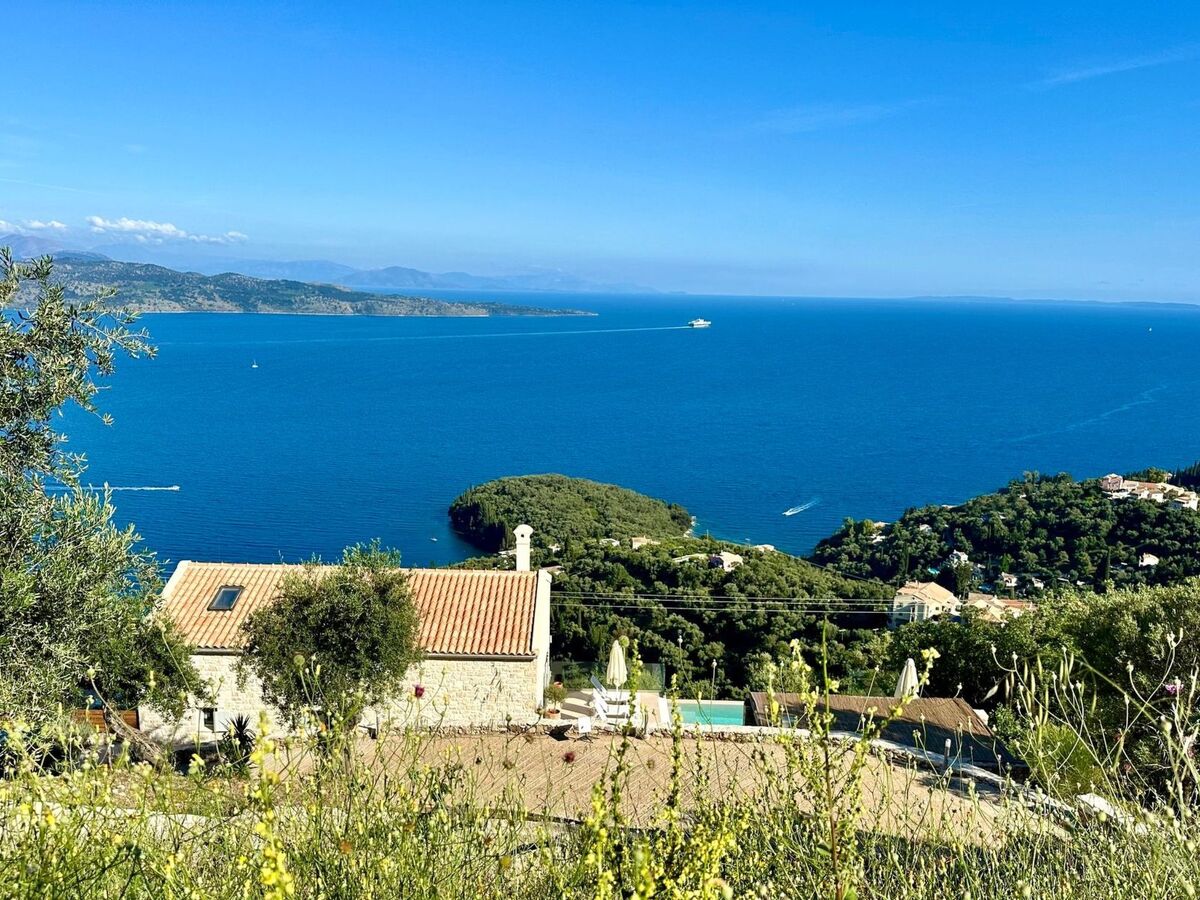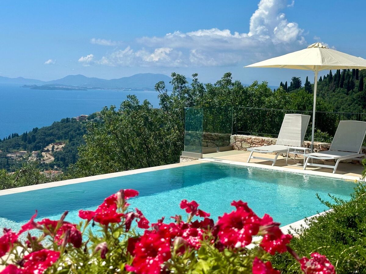 The villa is located in a spectacular location with panoramic views of the sea and mainland, just a short drive from Kalami, Kouloura, and Agni.
