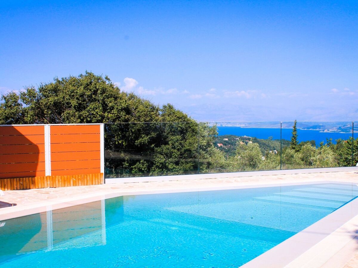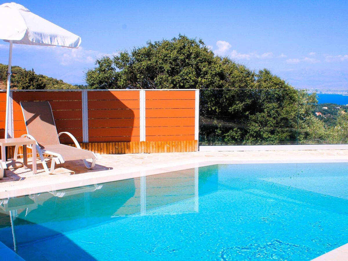 The villa features a private pool with comfortable loungers and parasols, offering the perfect spot to soak up the sun and enjoy the stunning sea views.