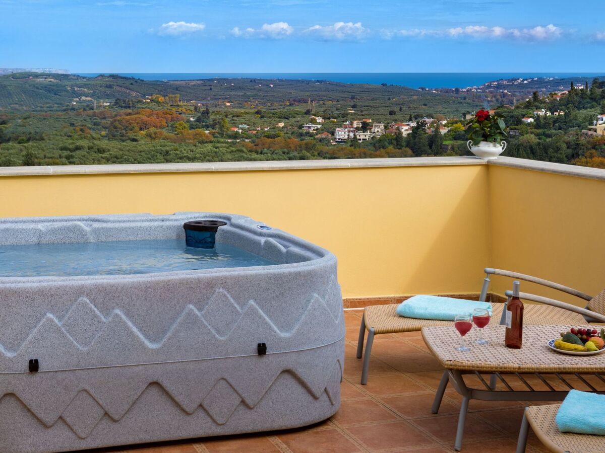 Jacuzzi privé chauffé sur la terrasse avec vue imprenable sur la mer et les montagnes, calme et tranquillité dans le petit village traditionnel, près de la mer et à 20 minutes en voiture de la ville de La Canée