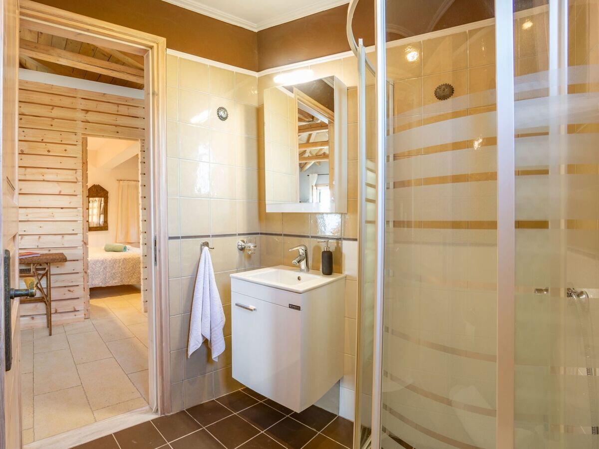 Staircase with handmade iron banisters leads down to one double bedroom leading to garden terrace; bathroom with shower; one twin-bedded room, with ensuite bathroom (marble) and jacuzzi bath, leading to garden terrace.