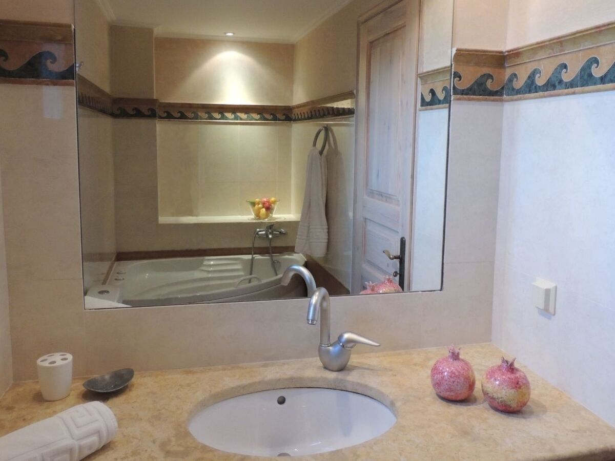 Staircase with handmade iron banisters leads down to one double bedroom leading to garden terrace; bathroom with shower; one twin-bedded room, with ensuite bathroom (marble) and jacuzzi bath, leading to garden terrace.