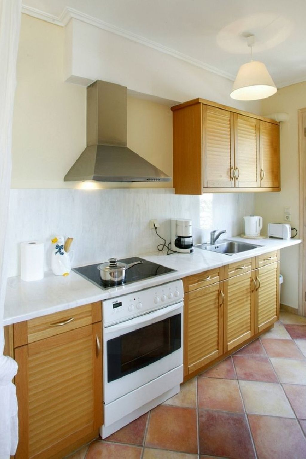 The wood-coloured built-in kitchen is equipped with the latest appliances: dishwasher, ceramic hob with an elegant stainless steel cooker hood, oven, fridge with freezer compartment, microwave, kettle, toaster and coffee machine.