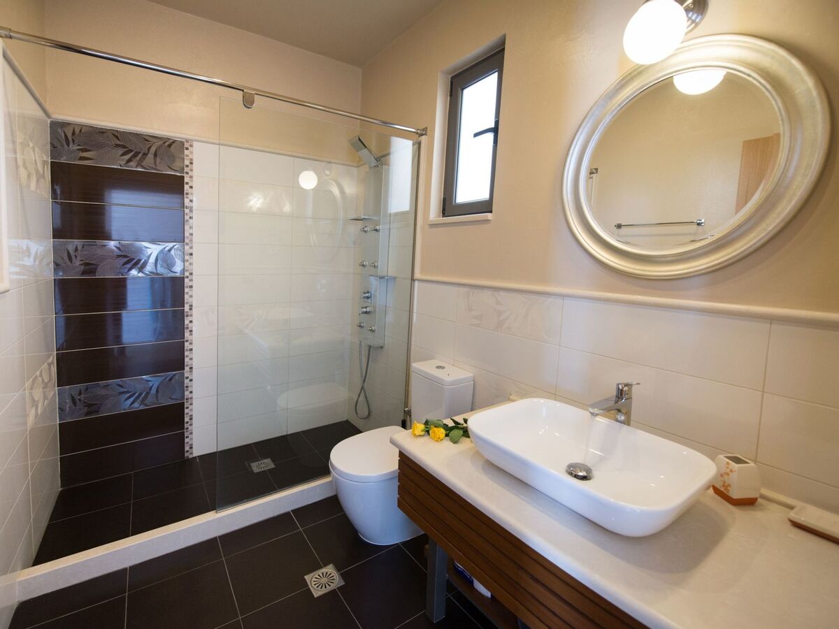 There is an en-suite bathroom with Jacuzzi column.Going a few stairs up, next to main entrance, you have the second bedroom, fitted with a double bed, large wardrobes and en-suite bathroom with Jacuzzi.