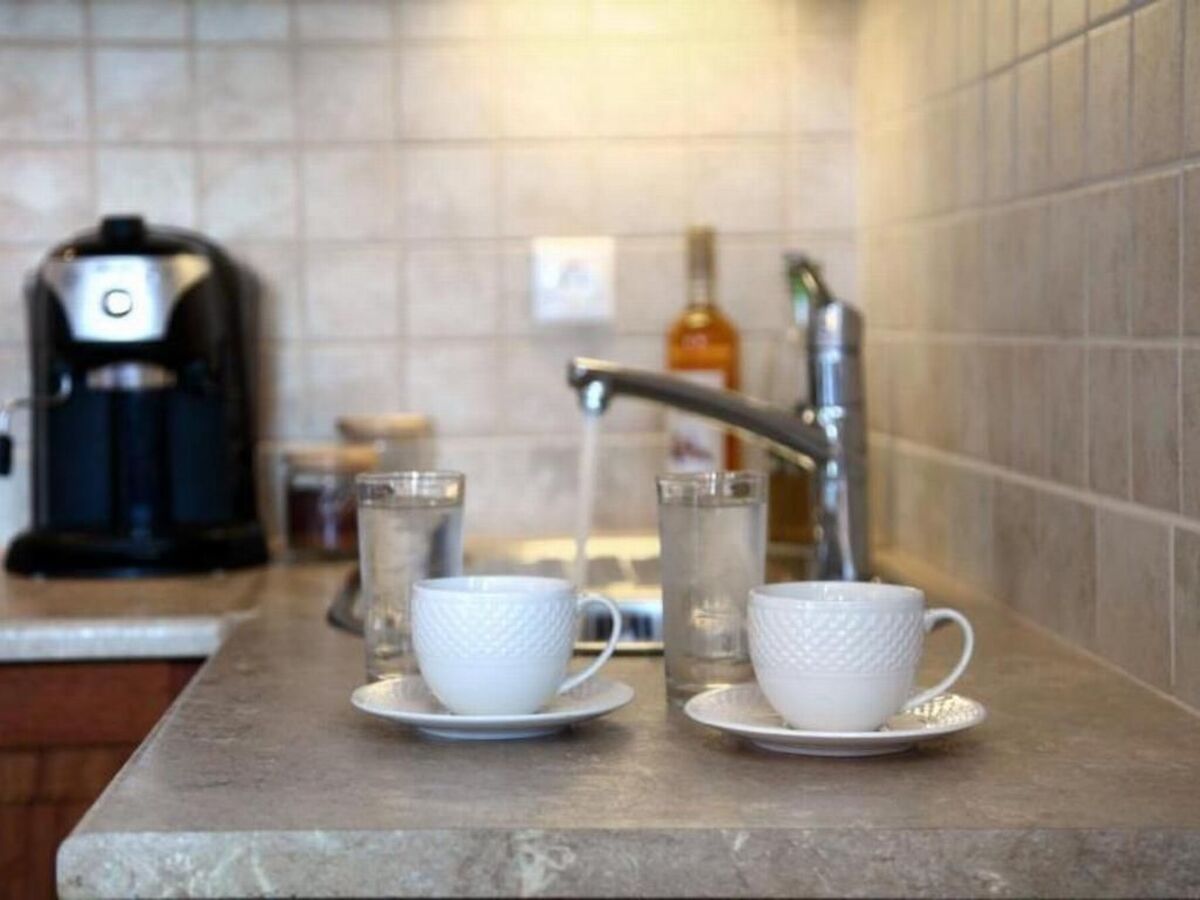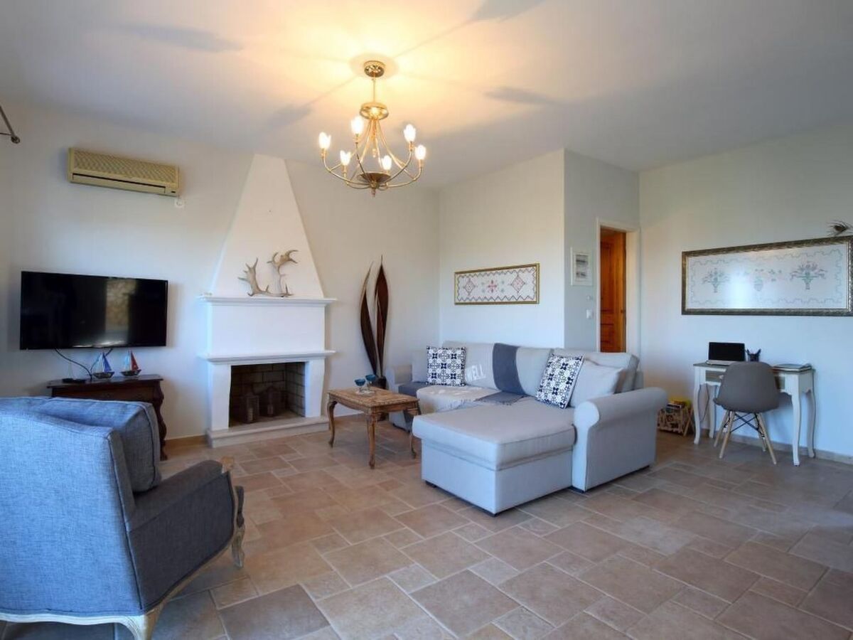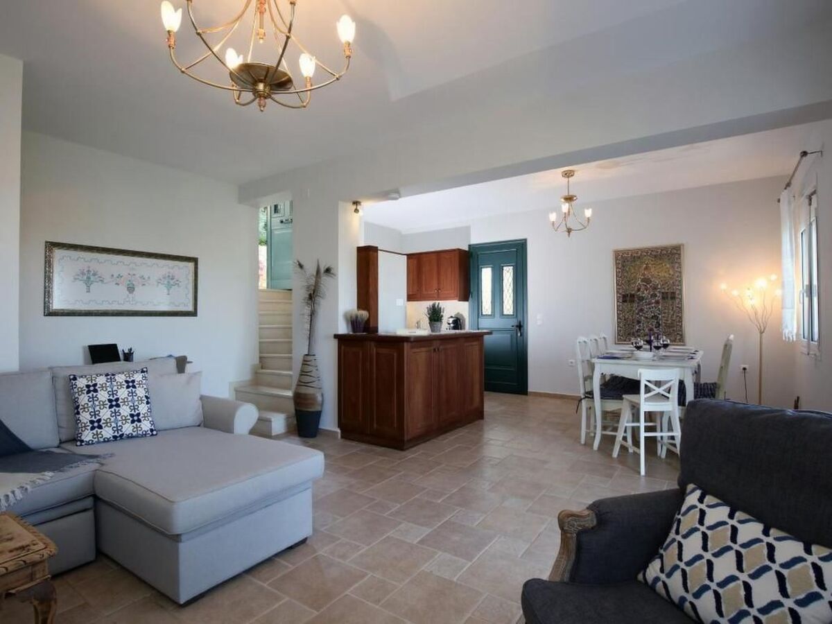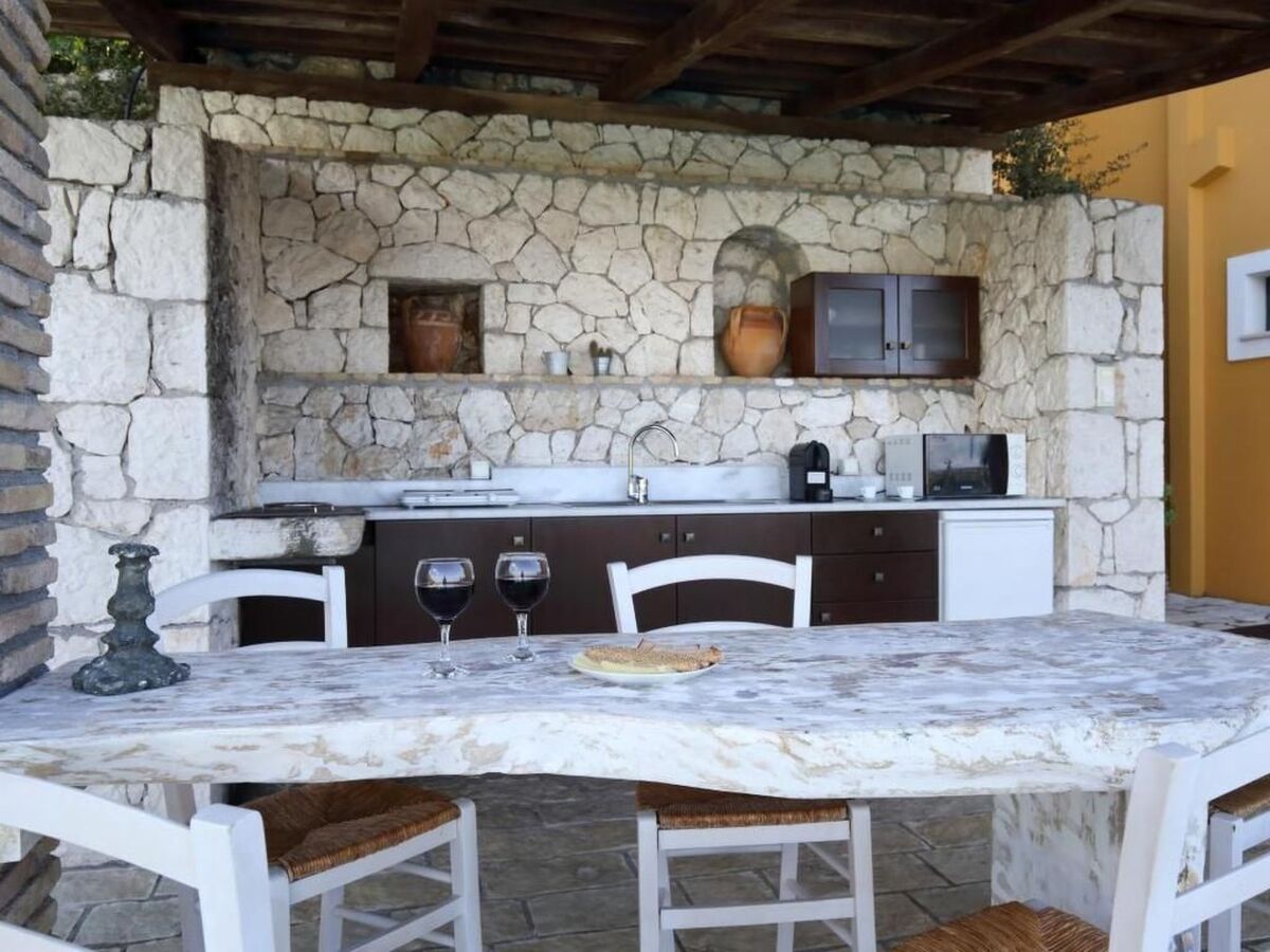 Ground floor has an open plan kitchen with dinning area and a sitting area with a traditional Lefkadian fireplace that leads to a shaded balcony .