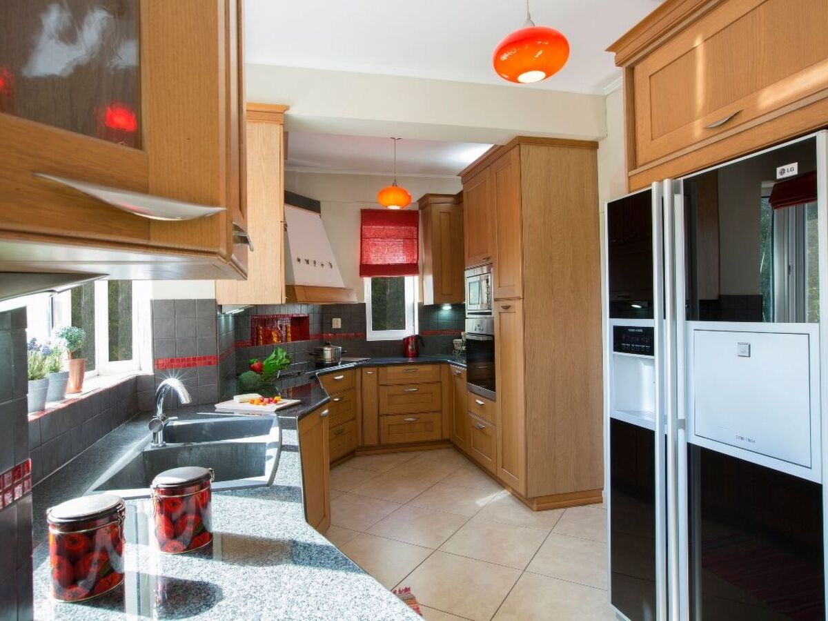 The kitchen is a chef's delight, equipped with a double fridge/freezer, filtered water, ice-maker, and a curved breakfast bar for casual dining.