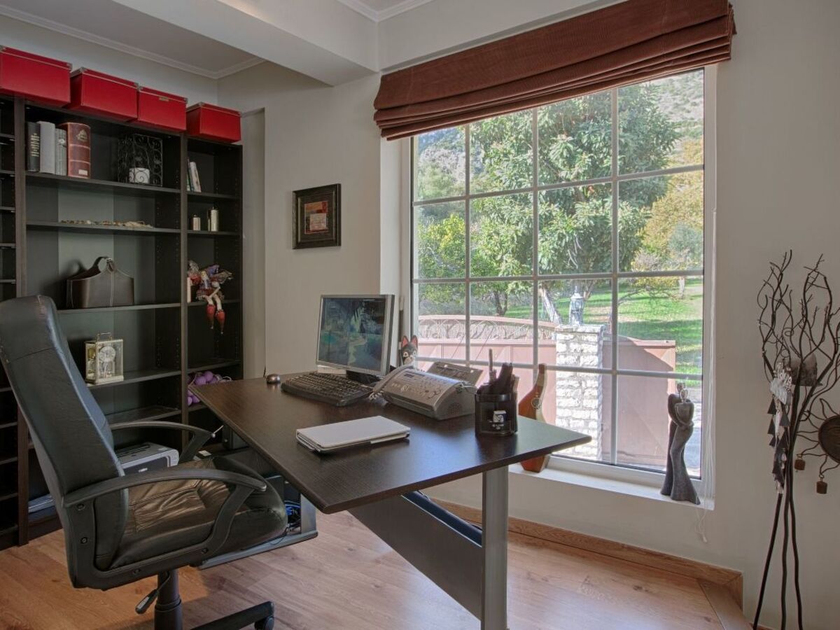 The setting is complemented by an open office space on the first floor, offering privacy and tranquility beside a large mullioned window that allows for ample natural light.