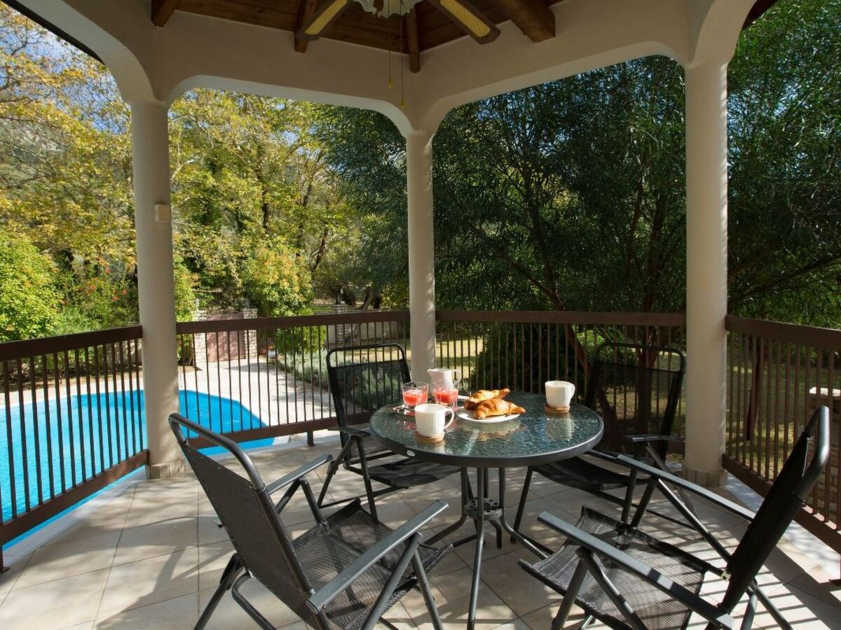 The villa’s exterior is equally impressive, featuring a charming gazebo terrace that overlooks a large, inviting pool.