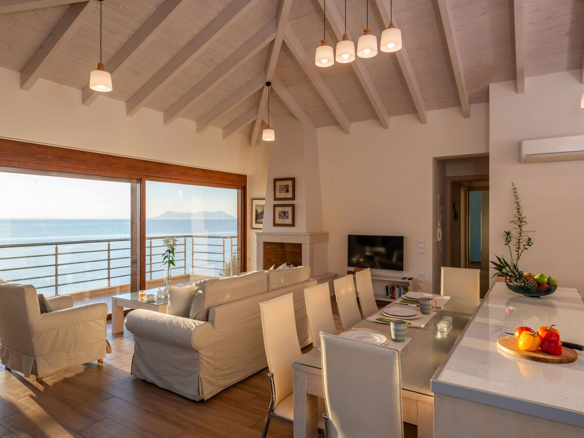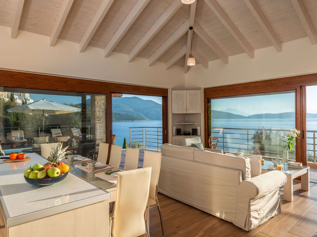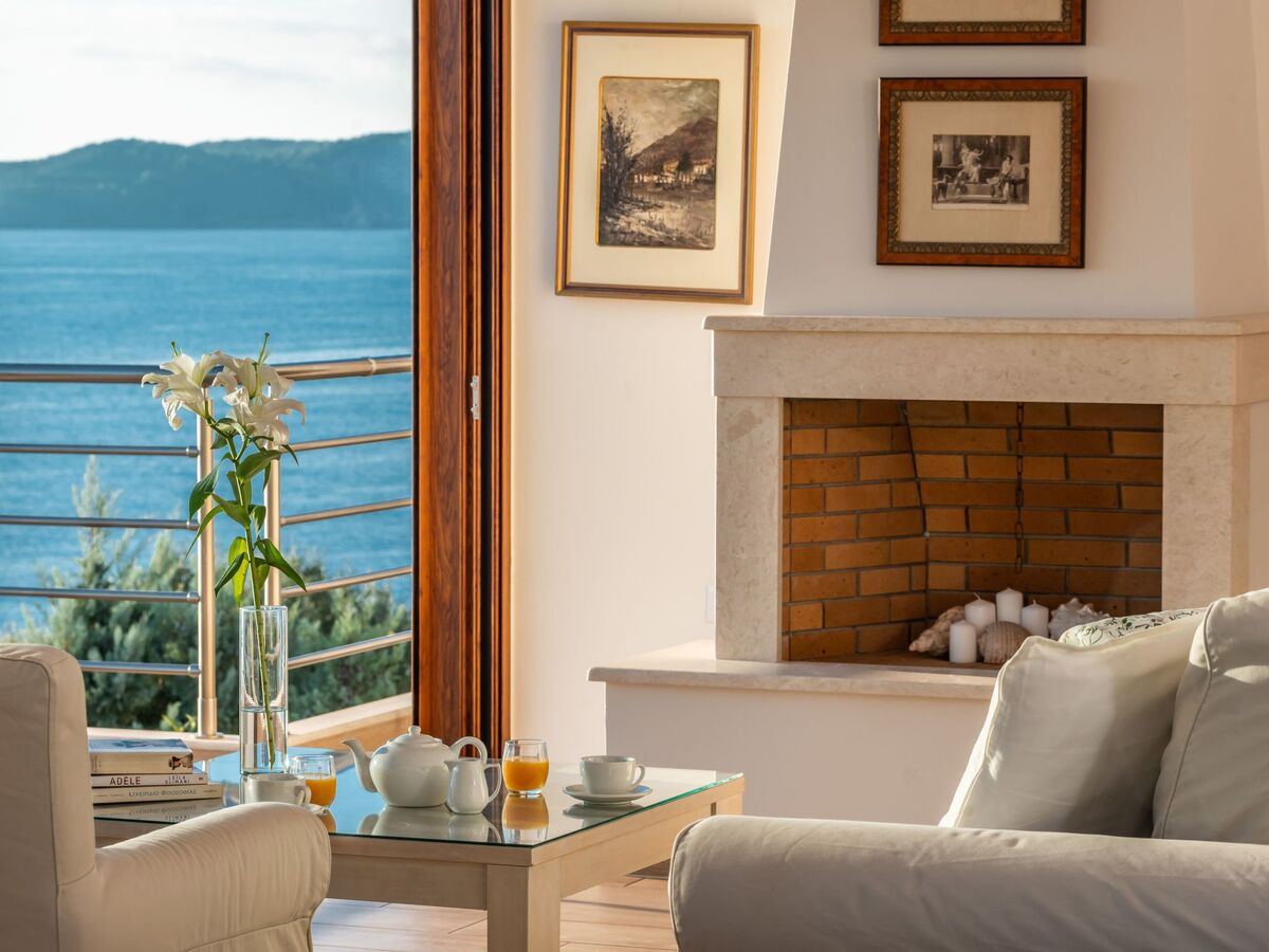 Every space invites the eye toward the shimmering Ionian horizon, blurring the boundary between indoors and outdoors.