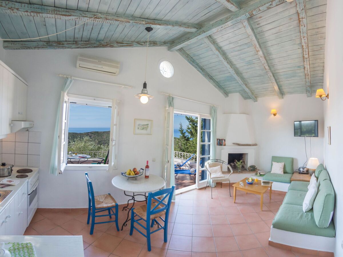The living area has a fireplace, and French windows that open onto a verandah with patio furniture.