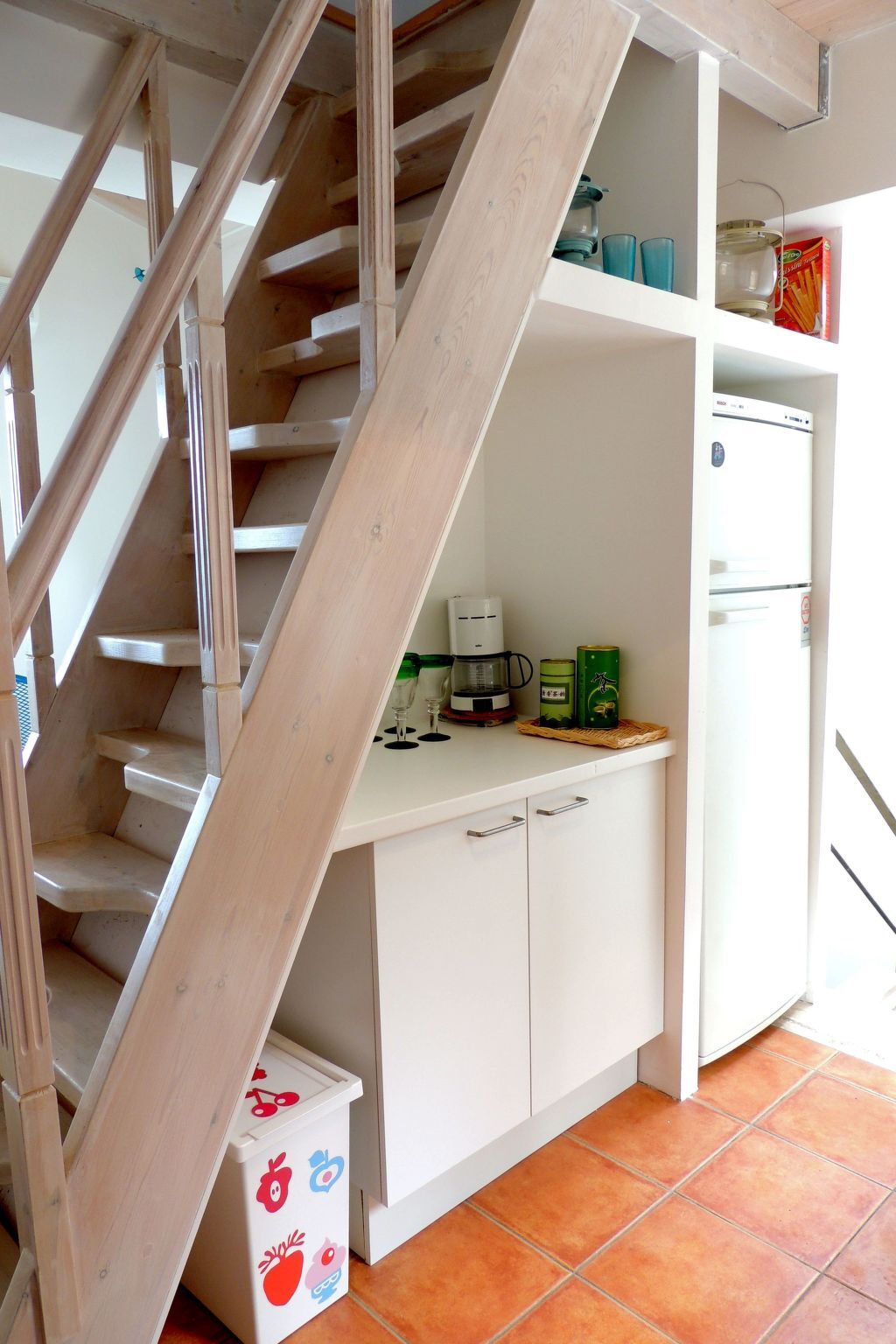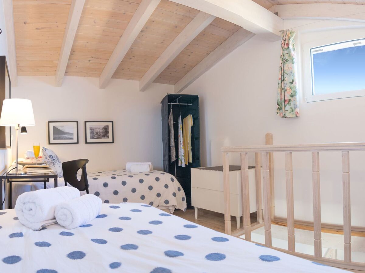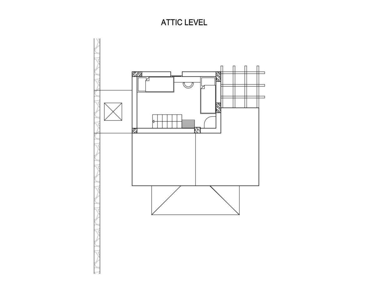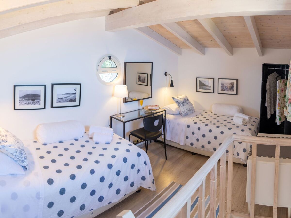 From the main level, an open staircase leads up to the attic ,as a third bedroom with two single beds.
