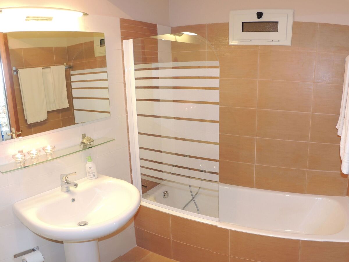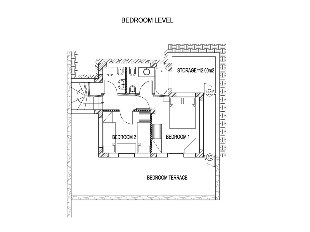 Staircase leads down to one double bedroom, with en-suite spacious bathroom, leading to big open terrace and one twin bedded room, leading to the same open terrace, next to another bathroom with shower.