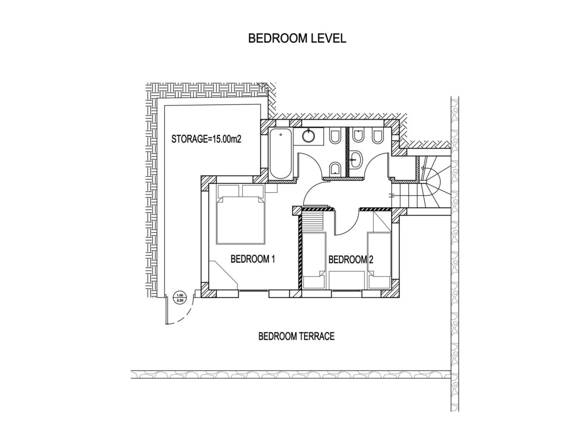 Staircase leads down to one double bedroom, with en-suite spacious bathroom, leading to big open terrace and one twin bedded room, leading to the same open terrace, next to another bathroom with shower.