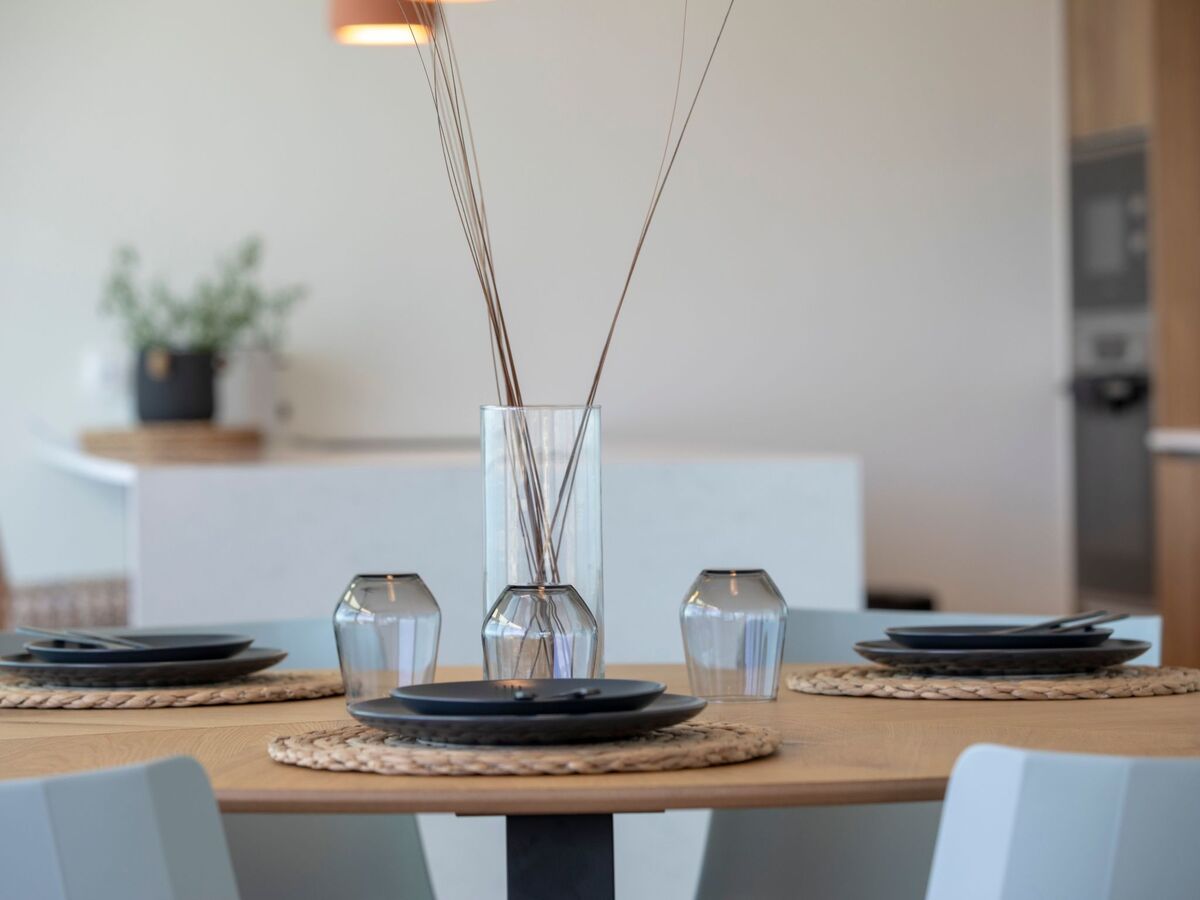A stylish dining area with a large table invites guests to enjoy meals together in comfort.