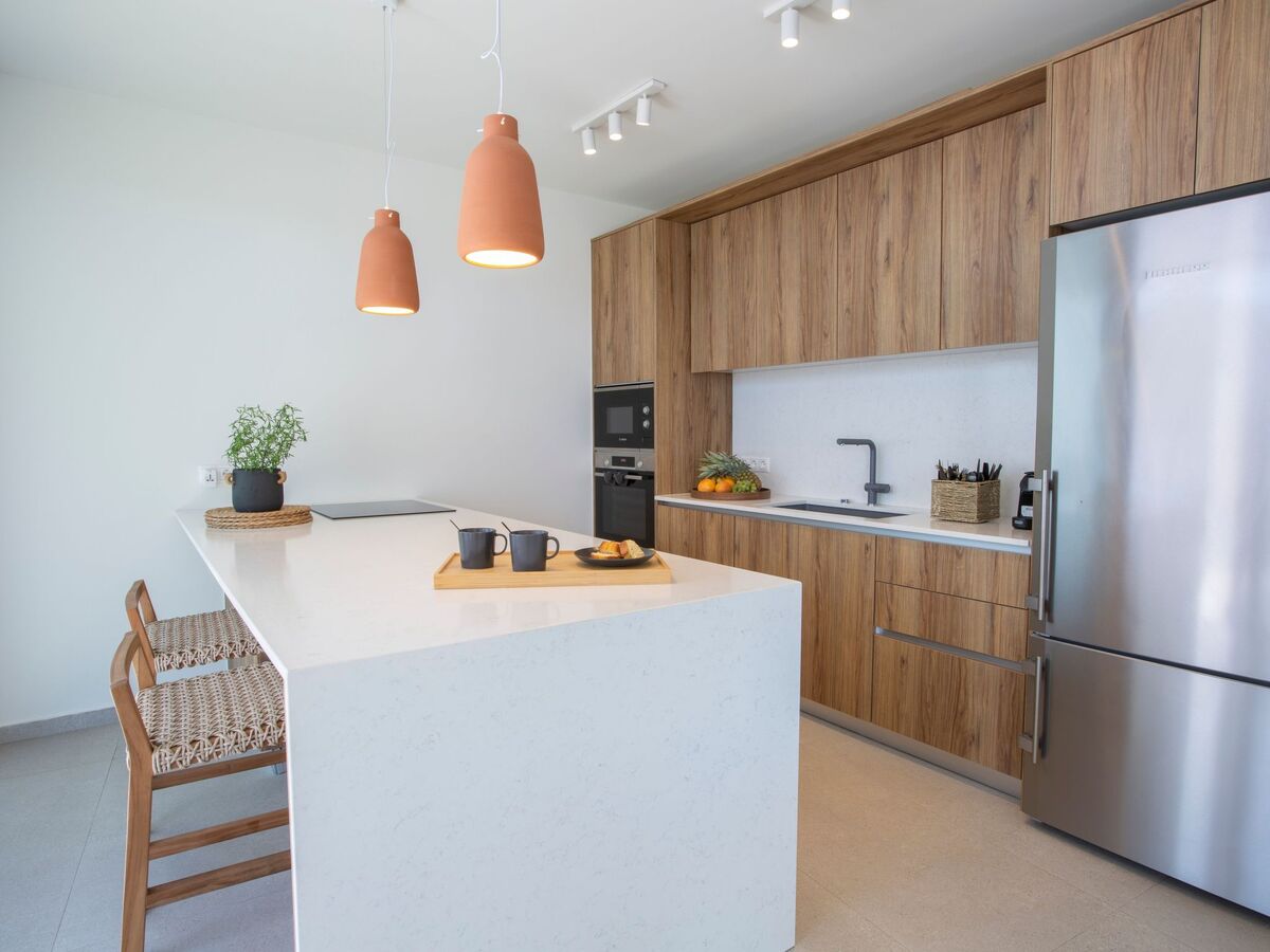 The fully equipped kitchen includes high-end appliances such as a refrigerator, oven, stove, microwave, and dishwasher.