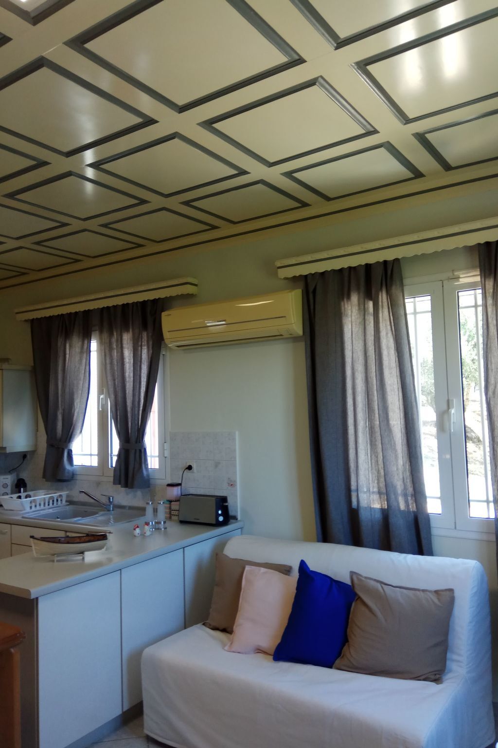 The ground floor is about 75 m² in size and comprises of the following rooms: A living room with a flat screen TV and 2 double sofa bed.