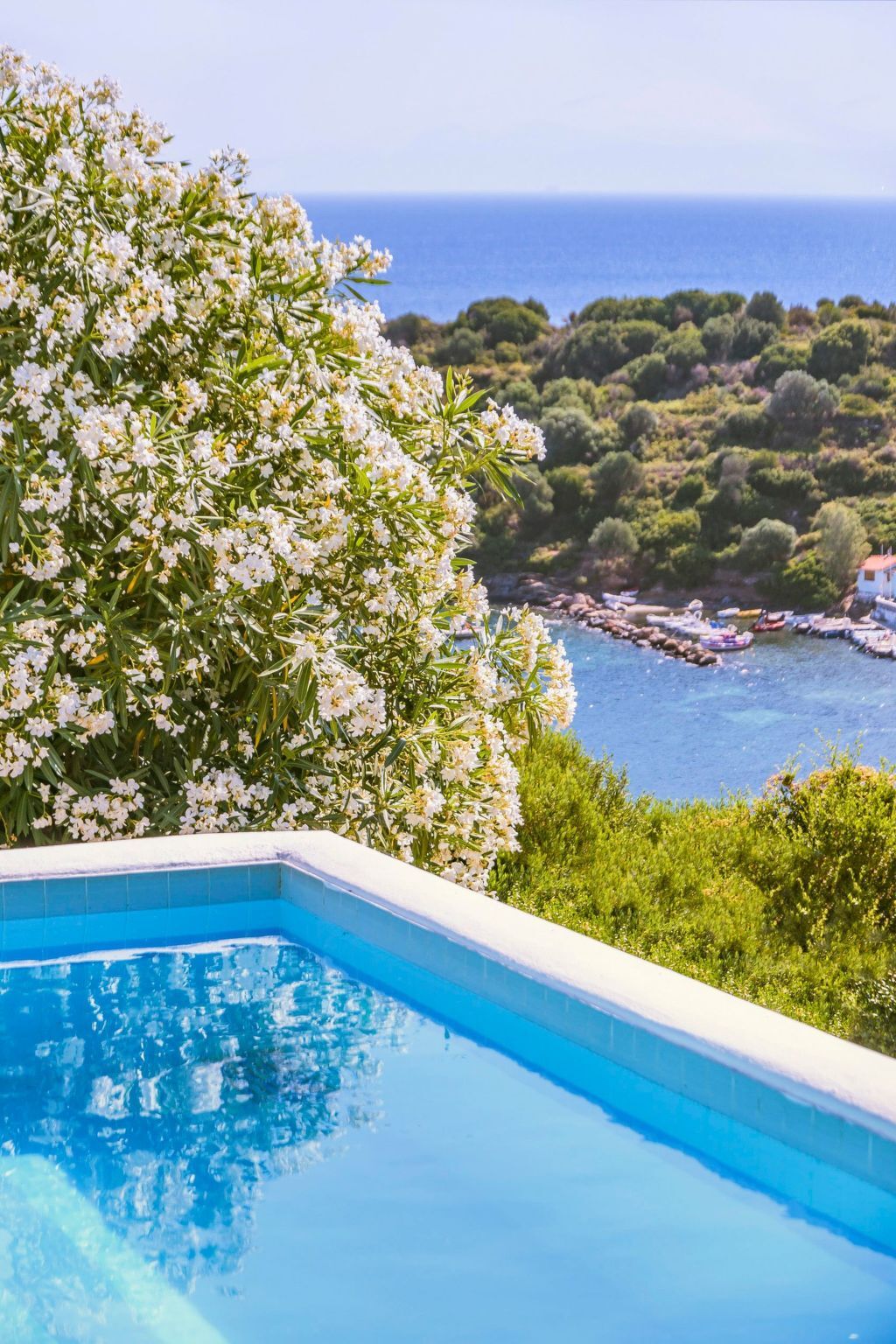 It is a 5000 square meters property, standing on a low hill, overlooking breathtaking vistas of the Aegean Sea and the Turkish coastline.