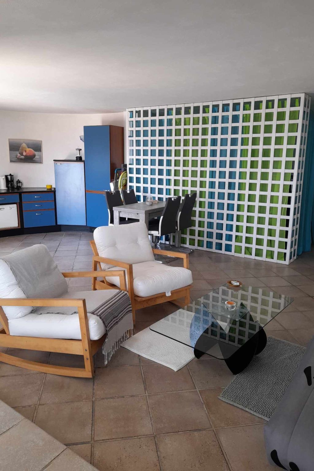 Plain pied pour 4/5 personnes, vue mer, open space comprenant cuisine avec lave linge et lave vaisselle/séjour avec canapé transformable/salle à manger.