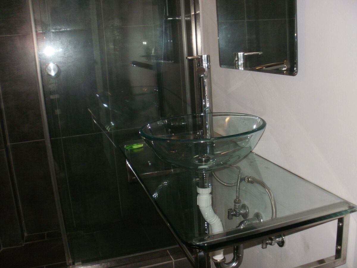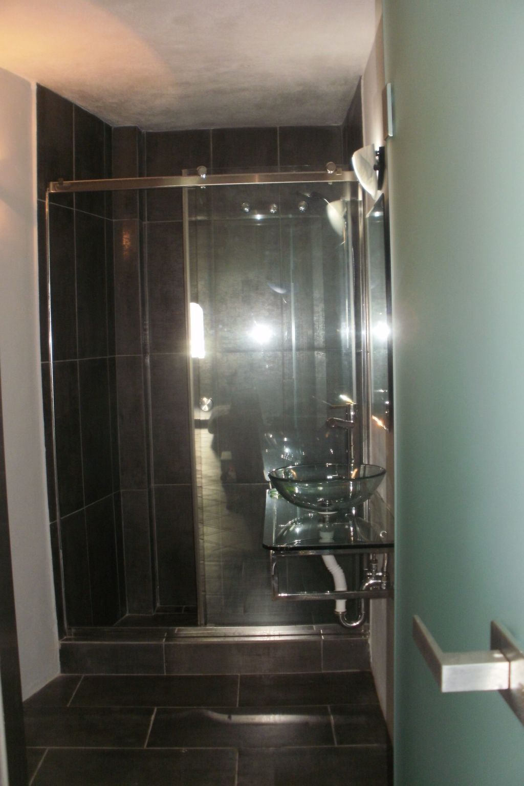 La salle de bain est petite mais bien conçue avec douche italienne.