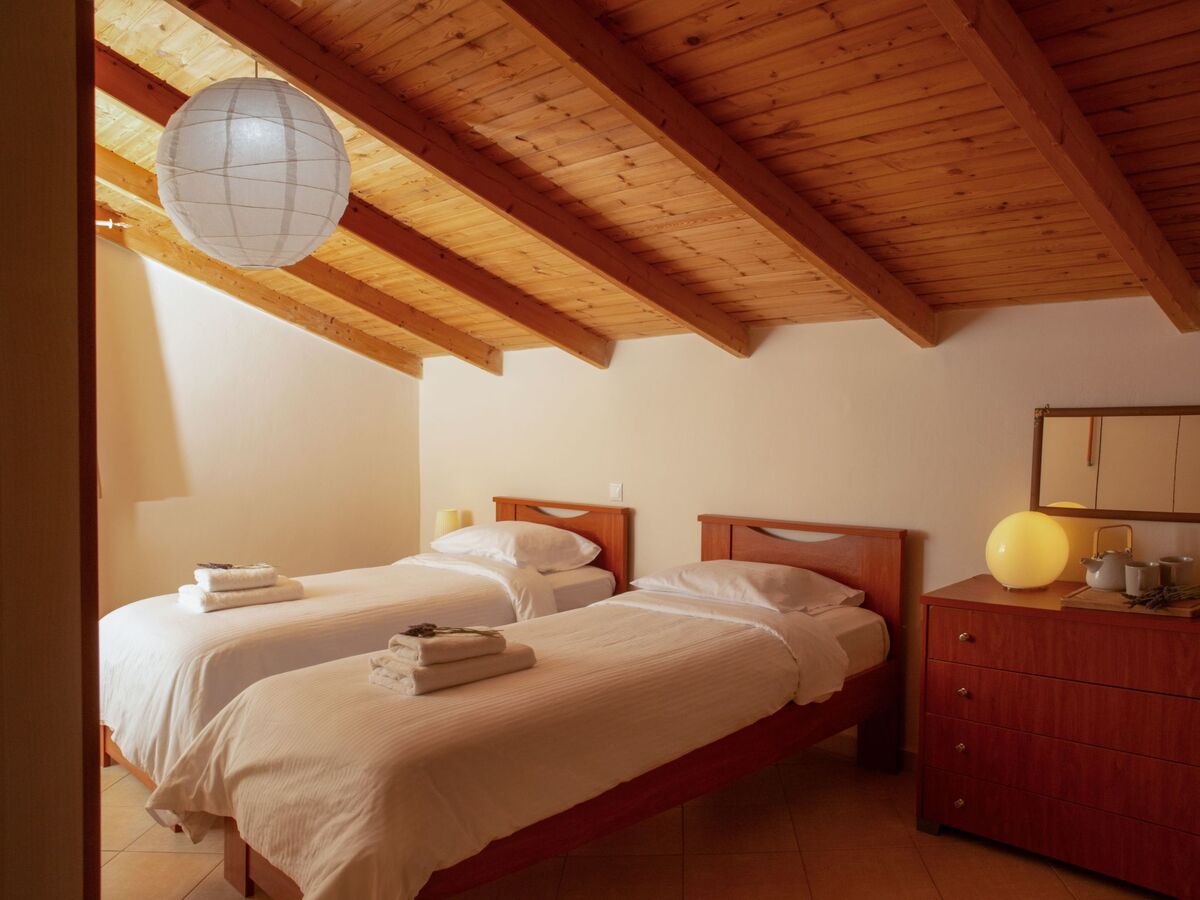 A marble staircase leads to the first floor, which includes: one big bedroom with double bed and one more with two single beds.
