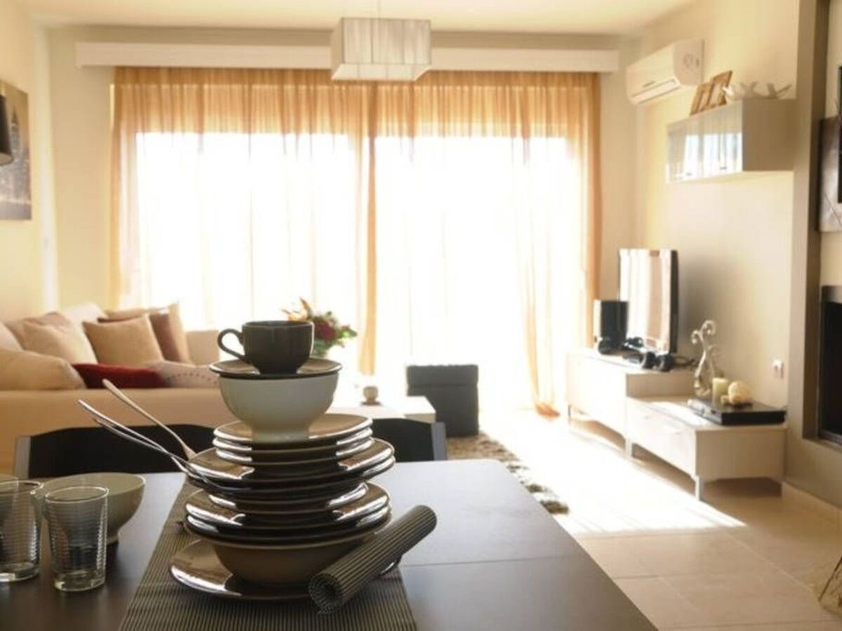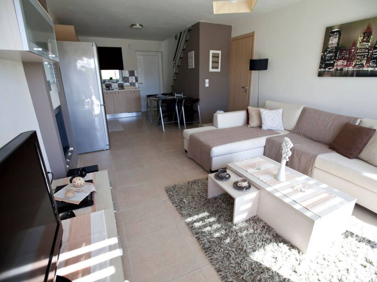 Comfortable and spacious lounge with sofas, TV etc, and access via French windows to outside dining patio and pool area.