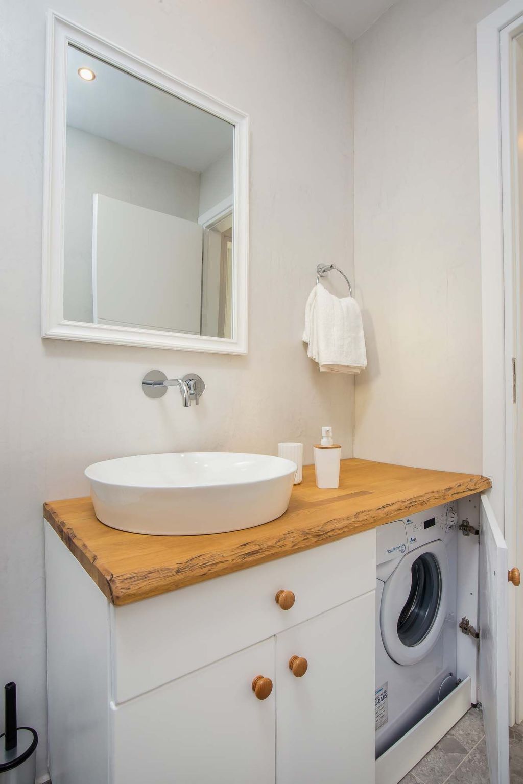 There’s a modern kitchen, fully equipped for any meal preparation along with a sitting area.