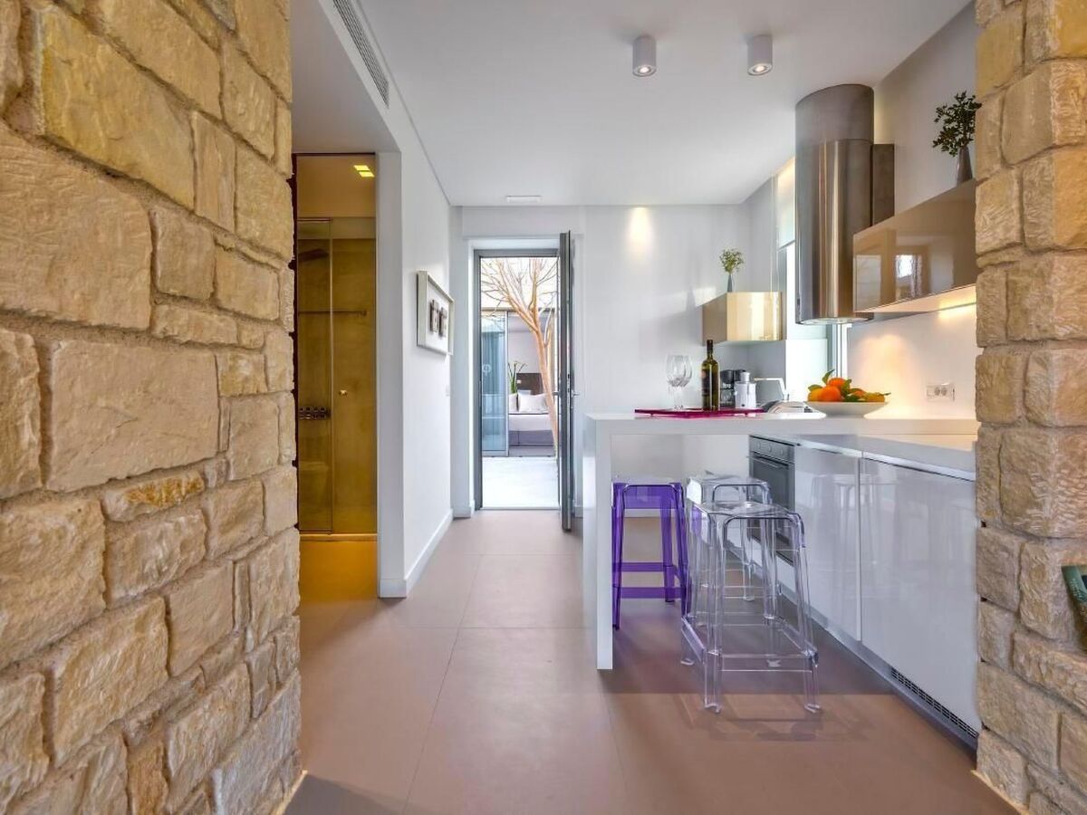 The indoor space transitions seamlessly to the external terrace, featuring a stylish al fresco dining area under a pergola that harmoniously balances shade and Mediterranean sunlight.