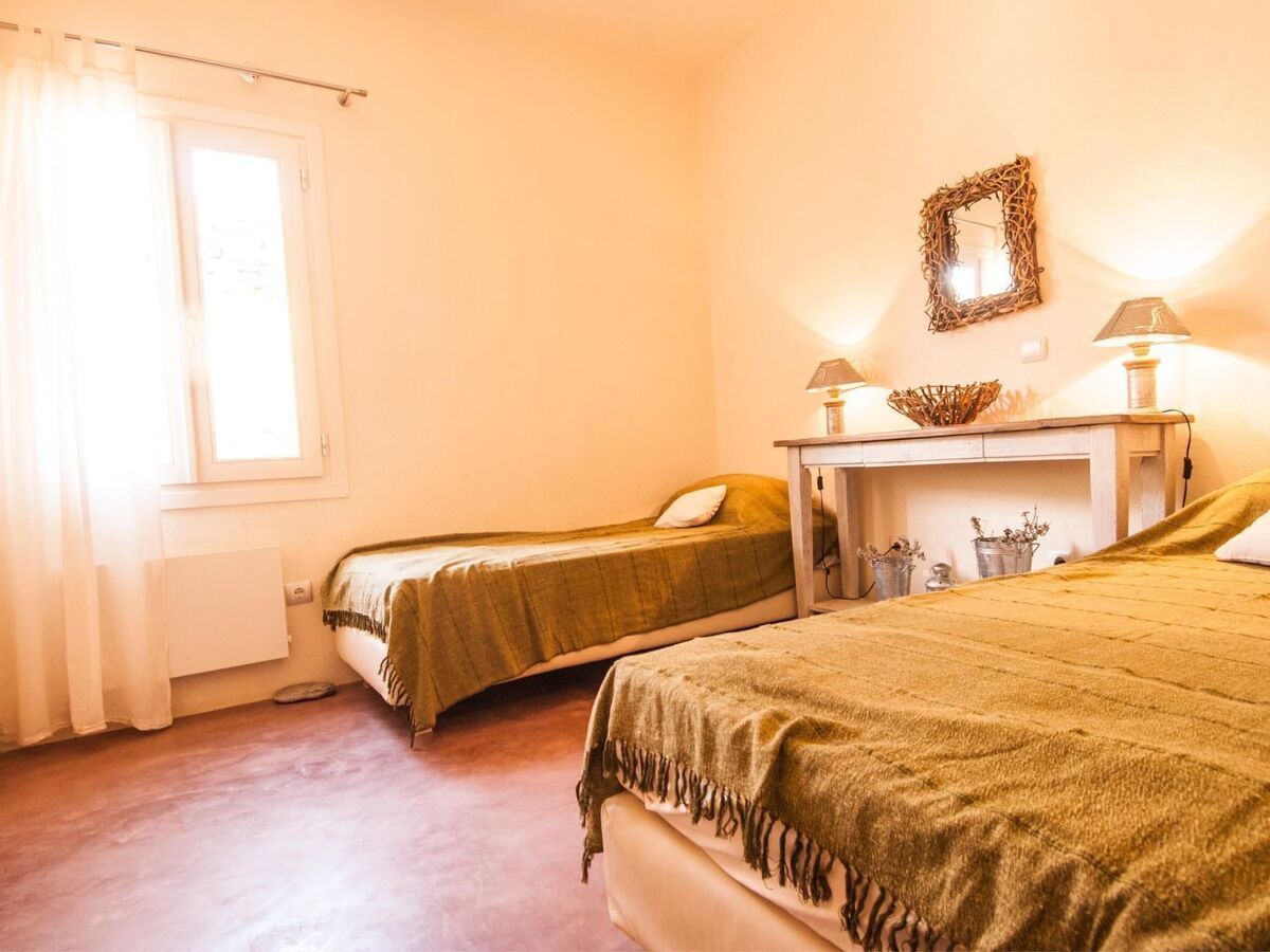 There are two bedrooms, one with a double bed and the other with two single beds.