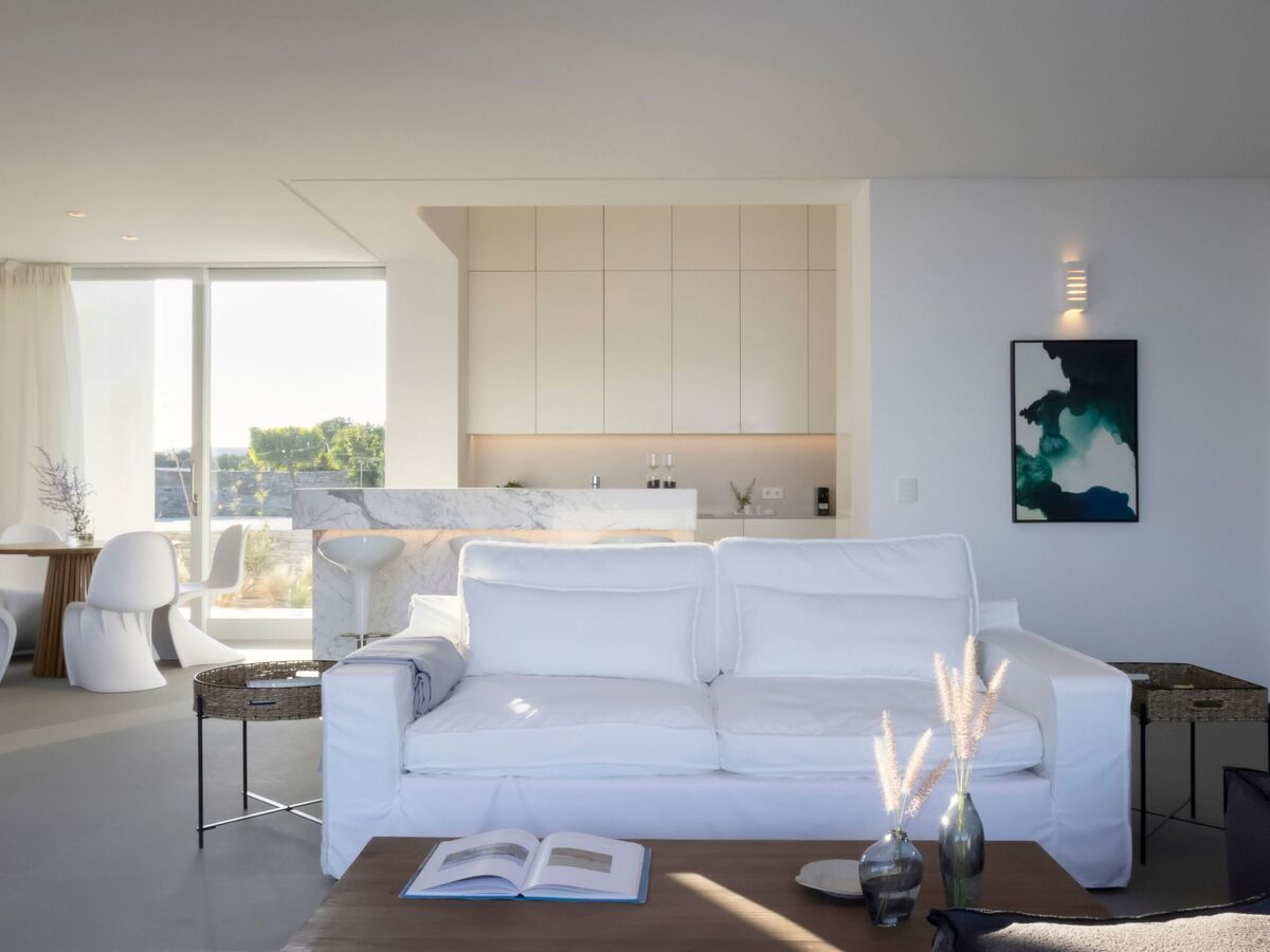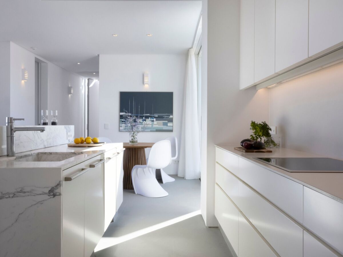 La véranda privée invite à des matinées de détente ou à des soirées sereines, et un salon extérieur au dernier étage, équipé de chaises longues, assure une intimité totale à ceux qui souhaitent se détendre tout en profitant des vues incroyables de la plage de Santa Maria et de ses environs.