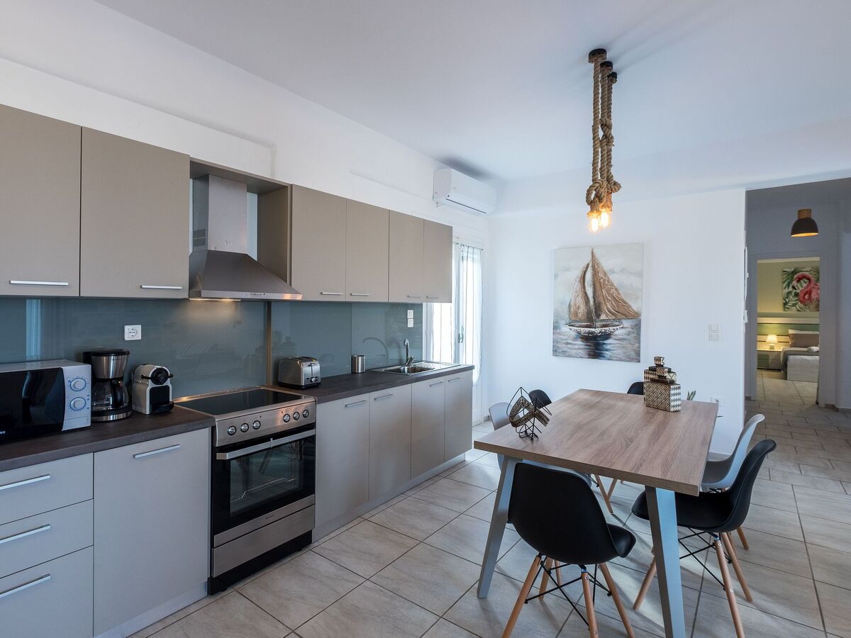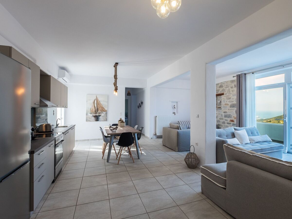 This residence is consisting of a big living room with two sofas and a coffee table, a dining table and a fully equipped open plan kitchen.
