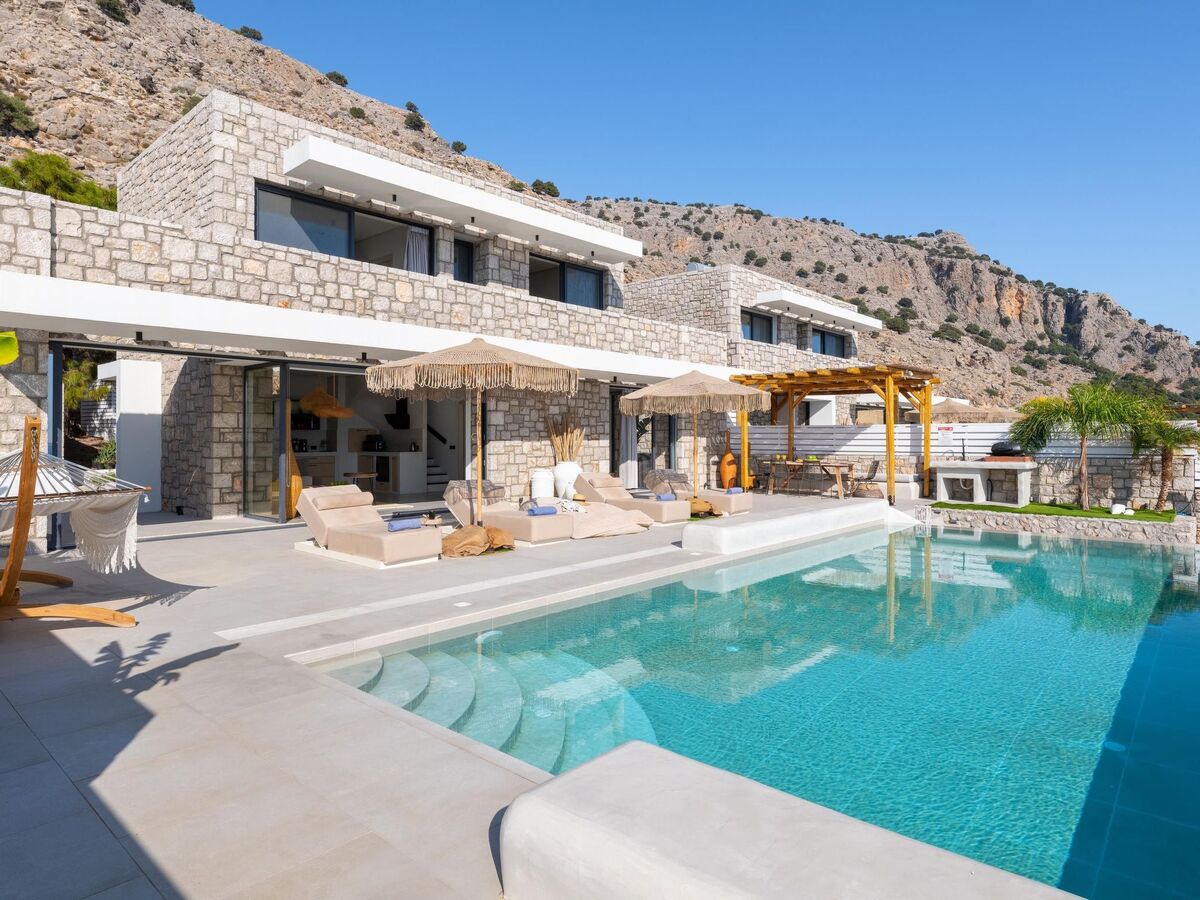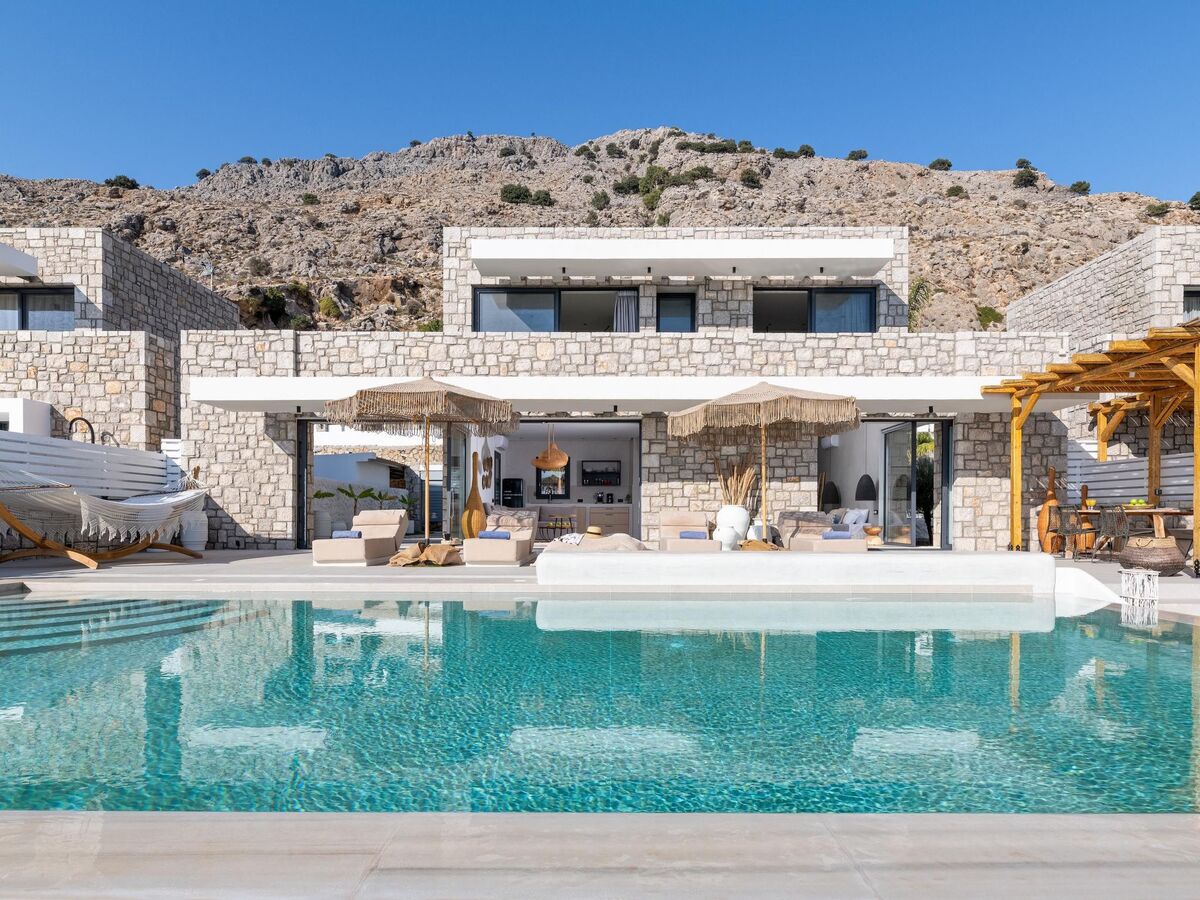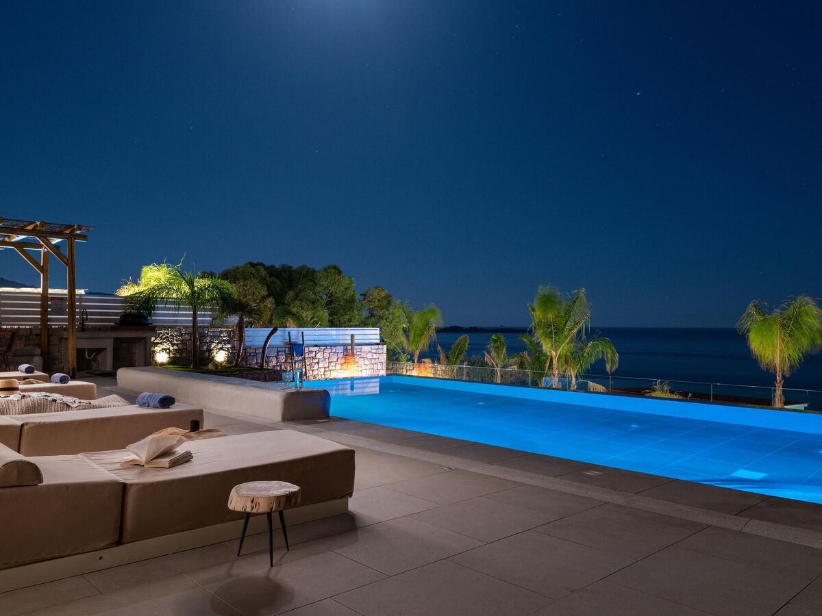 Outdoors, there’s a private swimming pool and surrounded by sunbeds and seating areas.