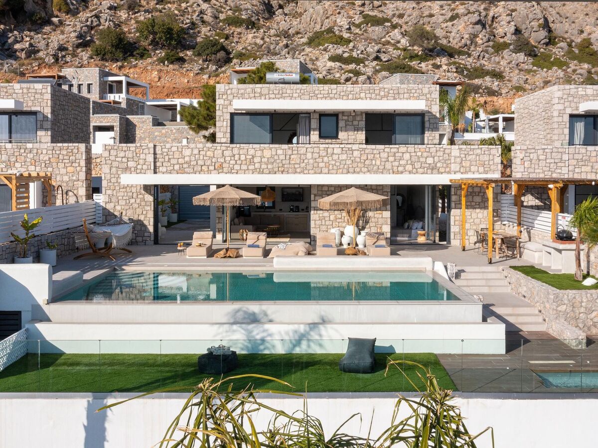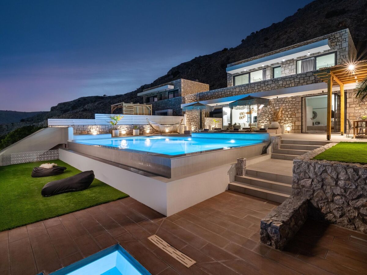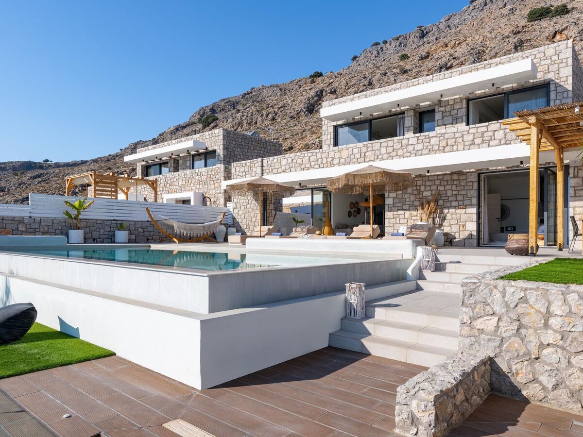 Outdoors, there’s a private swimming pool and surrounded by sunbeds and seating areas.