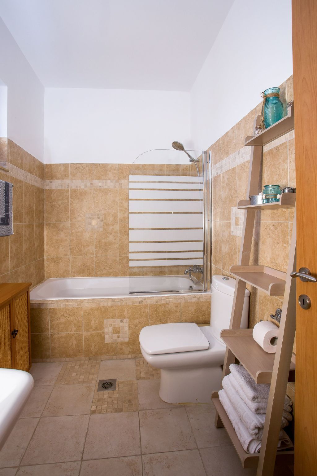 There is a comfortable living area with a fireplace, a fully equipped kitchen with a dining area and two bathrooms: one with a bath tub and one with a shower.