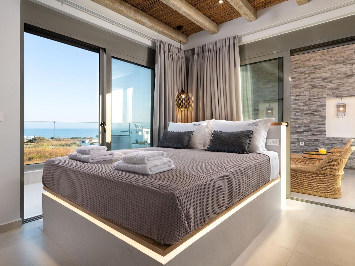 Les deux chambres possèdent une salle de bain attenante avec une douche élégante et un balcon meublé chic avec une vue remarquable sur la mer.