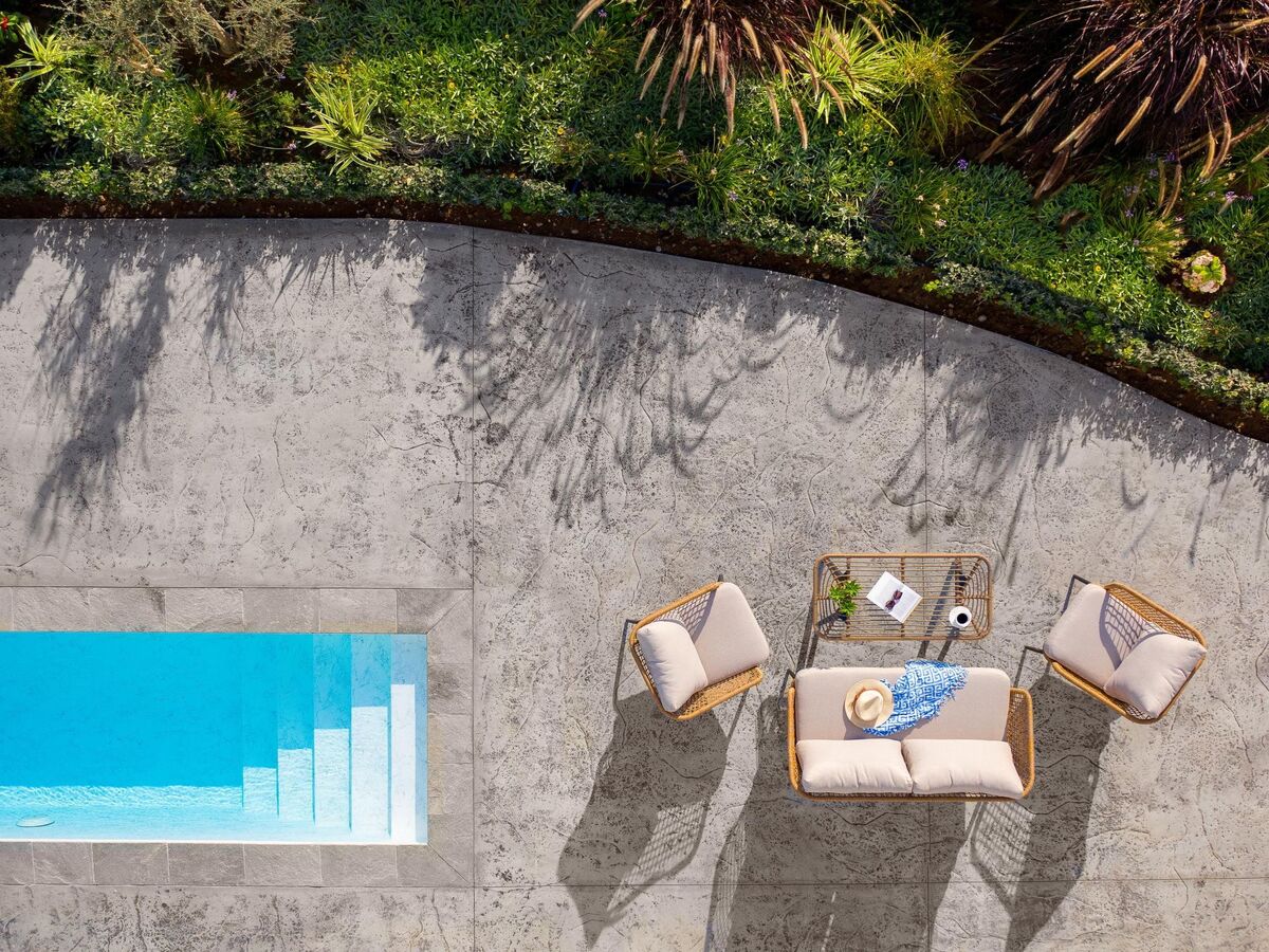 La piscine privée aux couleurs chaudes est équipée de chaises longues élégantes, de coussins confortables et de parasols, le tout entouré de pelouses luxuriantes et d'un jardin bien entretenu.