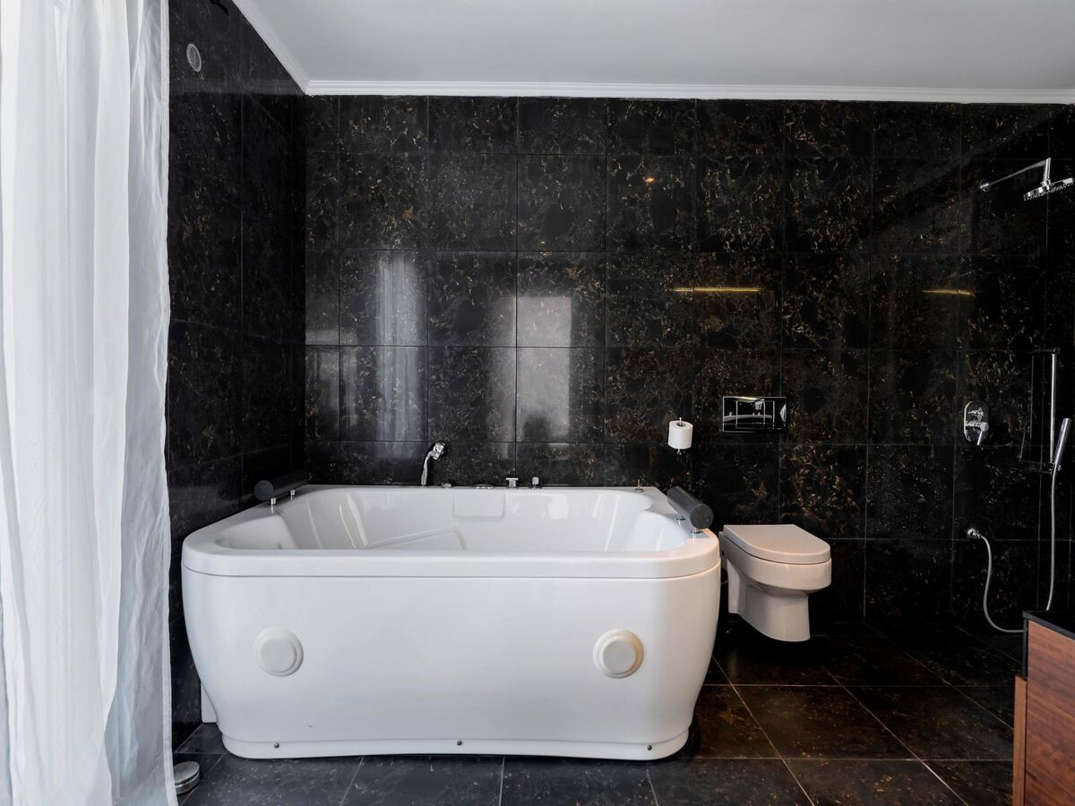 Two of the bathrooms have a bathtub and the rest two have showers.