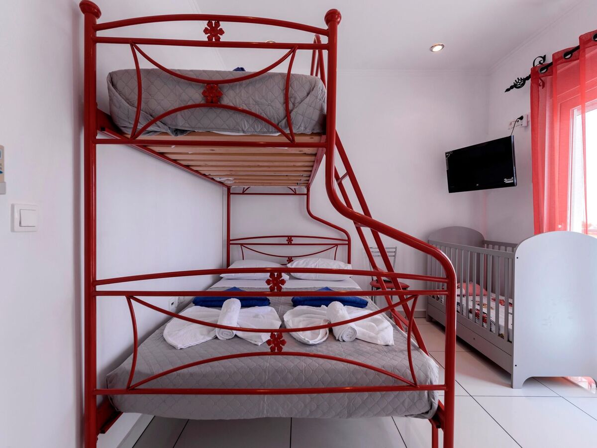 One of the bedrooms offers a double bed and bunk beds and the other bedroom has twin beds.