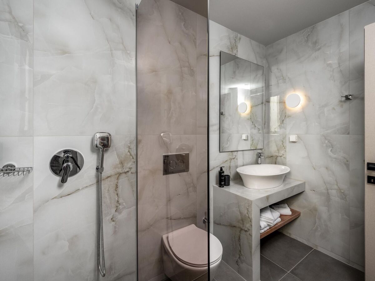 The villa features three bedrooms—two on the first floor with double beds and ensuite bathrooms with showers, and one on the ground floor with two single beds that can be combined into a double.