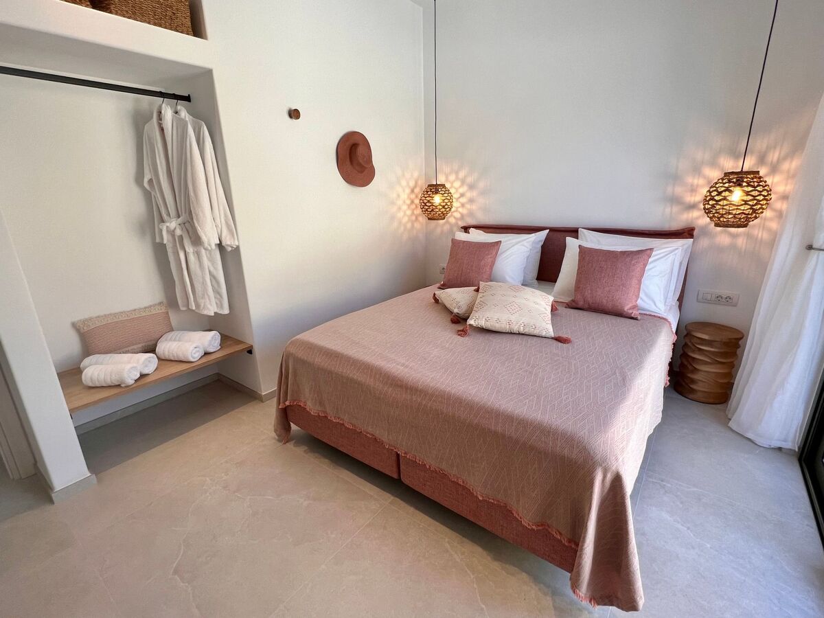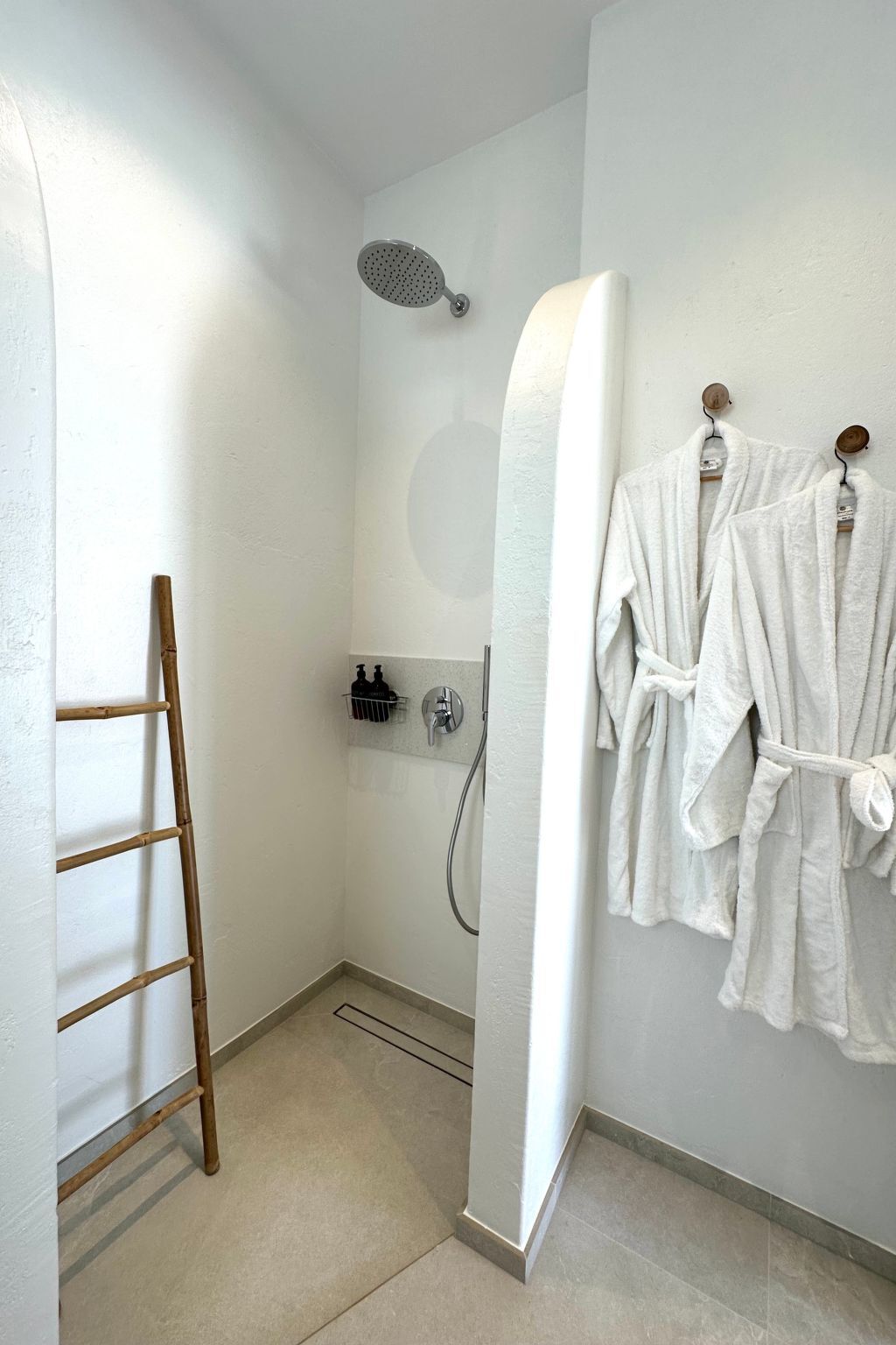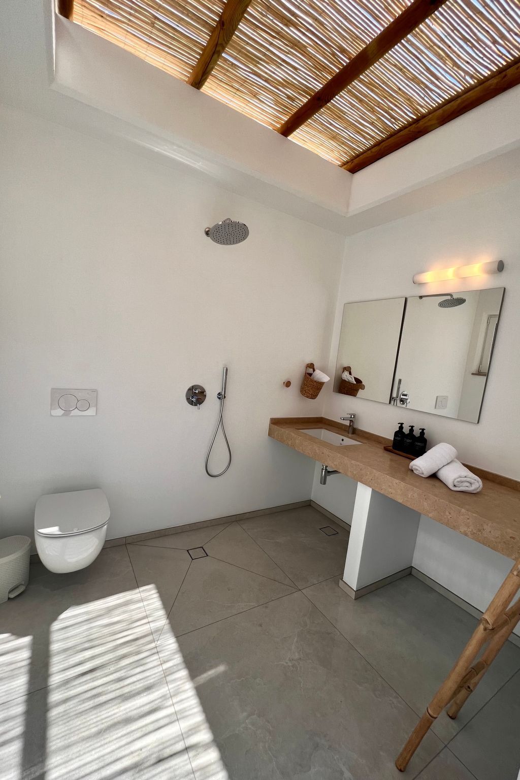 The first Suite offers a comfortable double bed with wonderful, panoramic views to the pool and the sea from the terrace, with its own en-suite bathroom with shower.