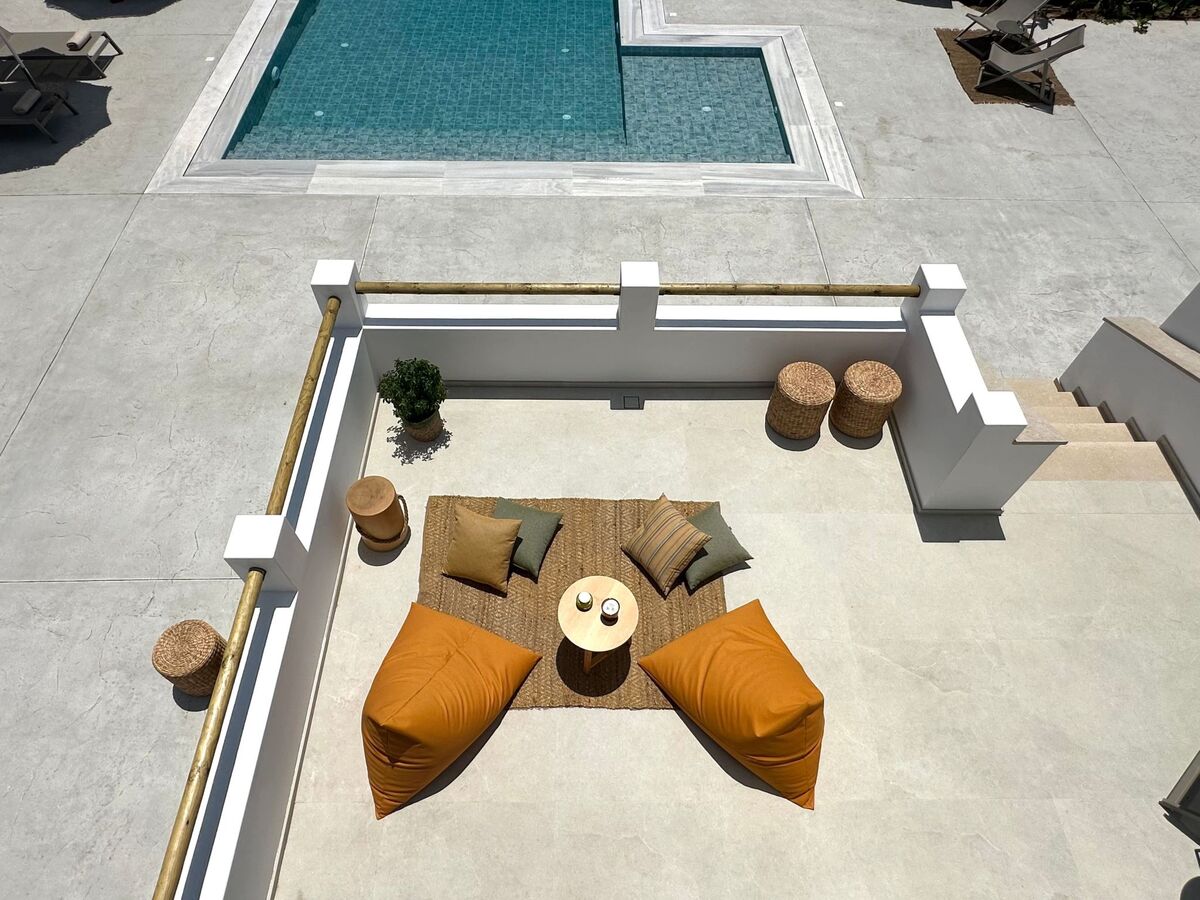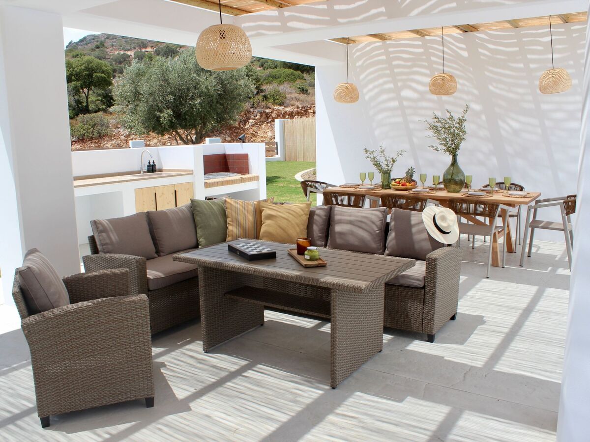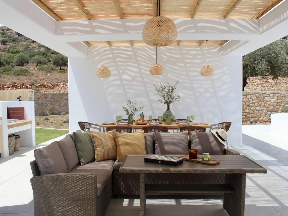 A wide fully-furnished lounge area is especially designed to create the perfect setting for a private dinner with loved ones by the pool, with a well-equipped bar, a comfortable seating area and a modern dining table for up to 8 guests.