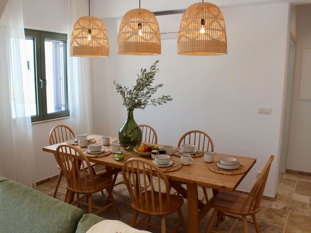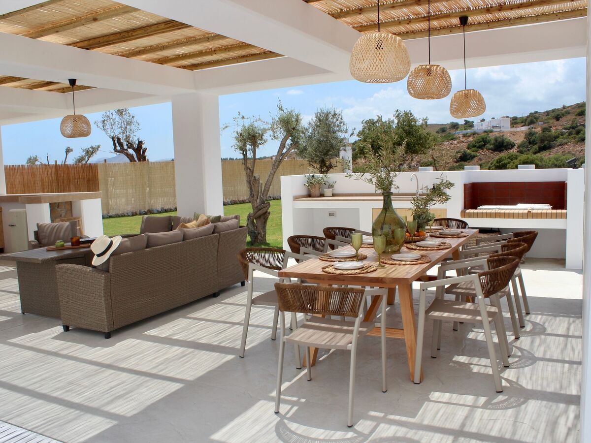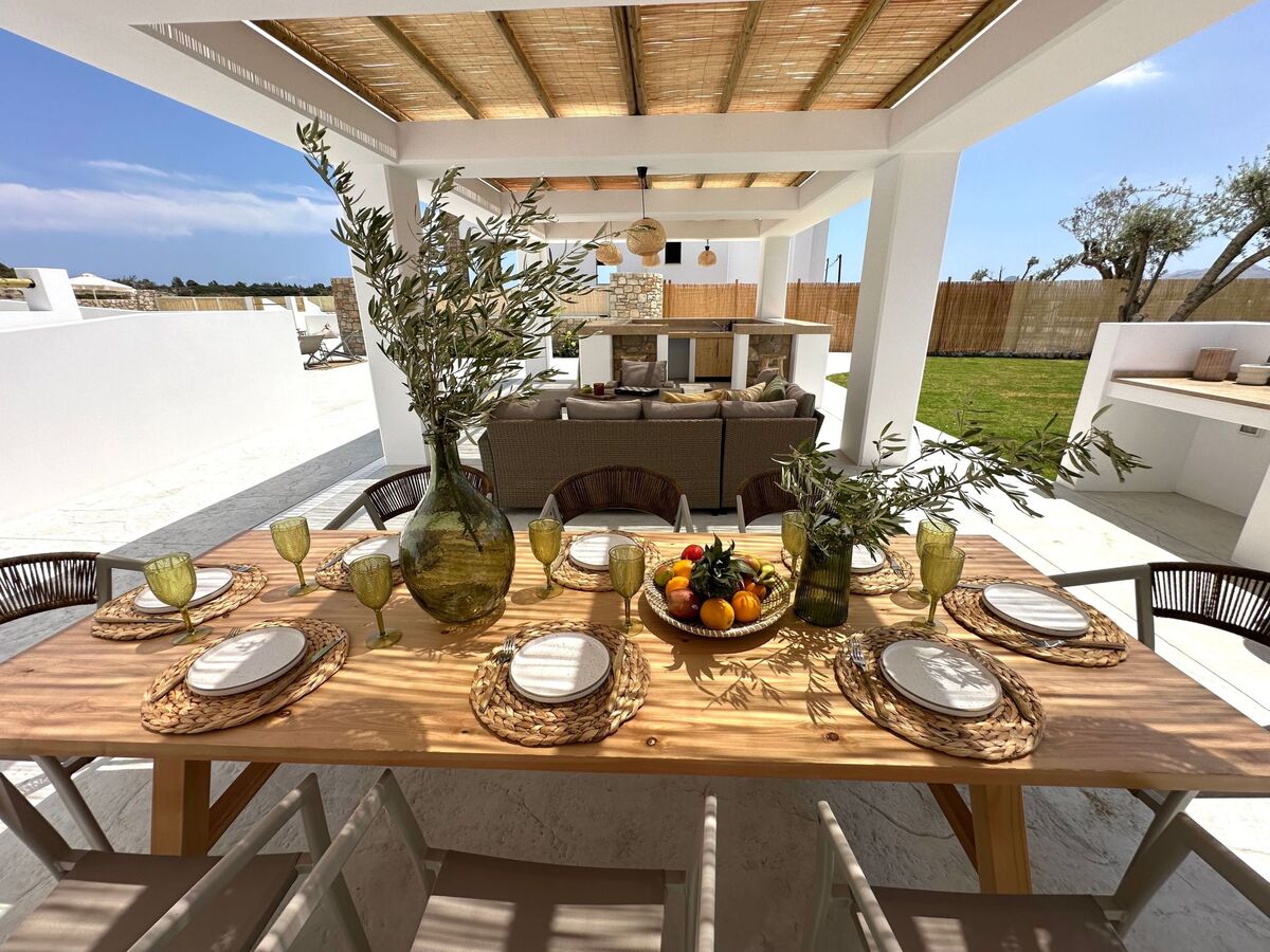 A wide fully-furnished lounge area is especially designed to create the perfect setting for a private dinner with loved ones by the pool, with a well-equipped bar, a comfortable seating area and a modern dining table for up to 8 guests.