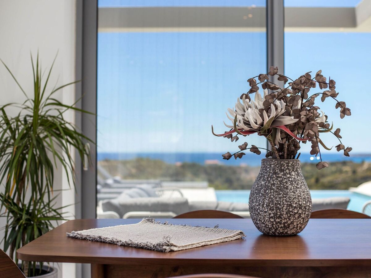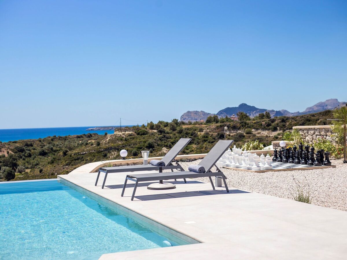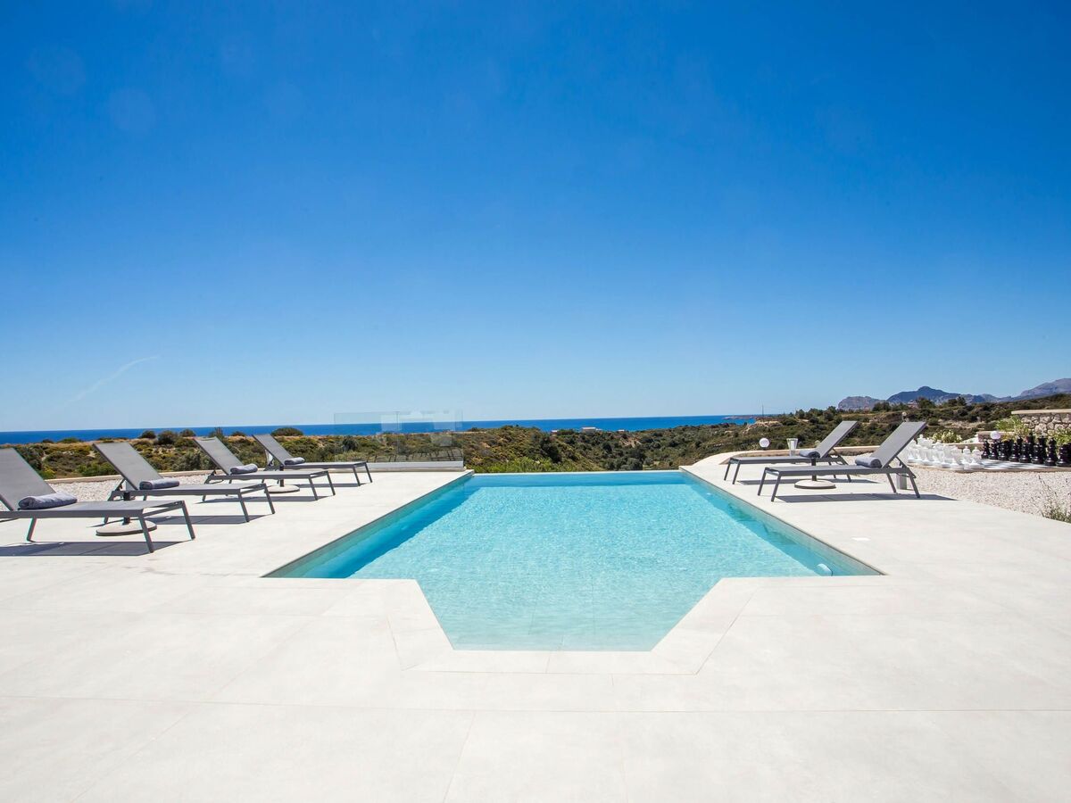 Outdoors, there is a marvelous private swimming pool surrounded by its sunbeds and the breathtaking sea view.