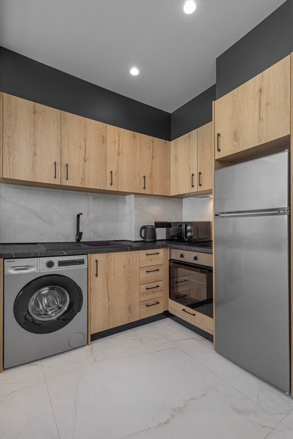 The fully equipped kitchen allows guests to prepare their own meals with ease, offering all the necessary appliances and utensils for a comfortable stay.