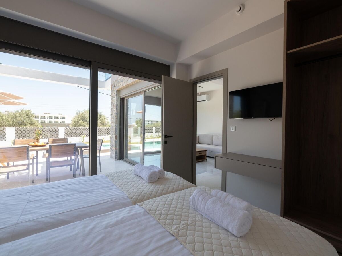 The city center of Rhodes is approximately 35 km away, while the famous village of Lindos is about 25 km from the villas, both easily accessible for day trips.