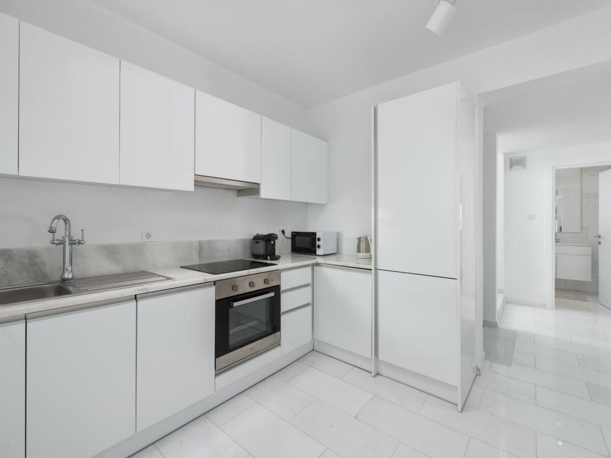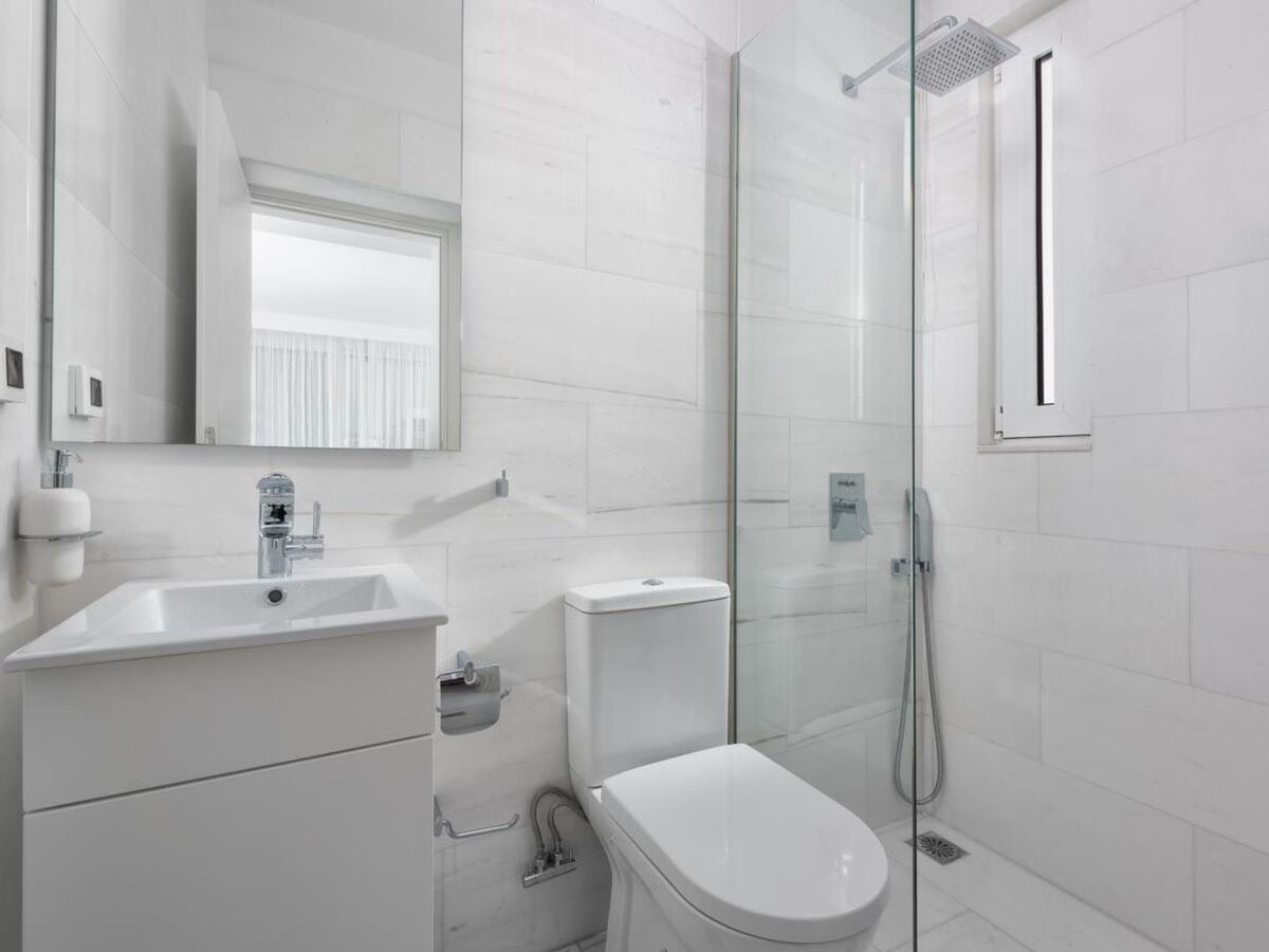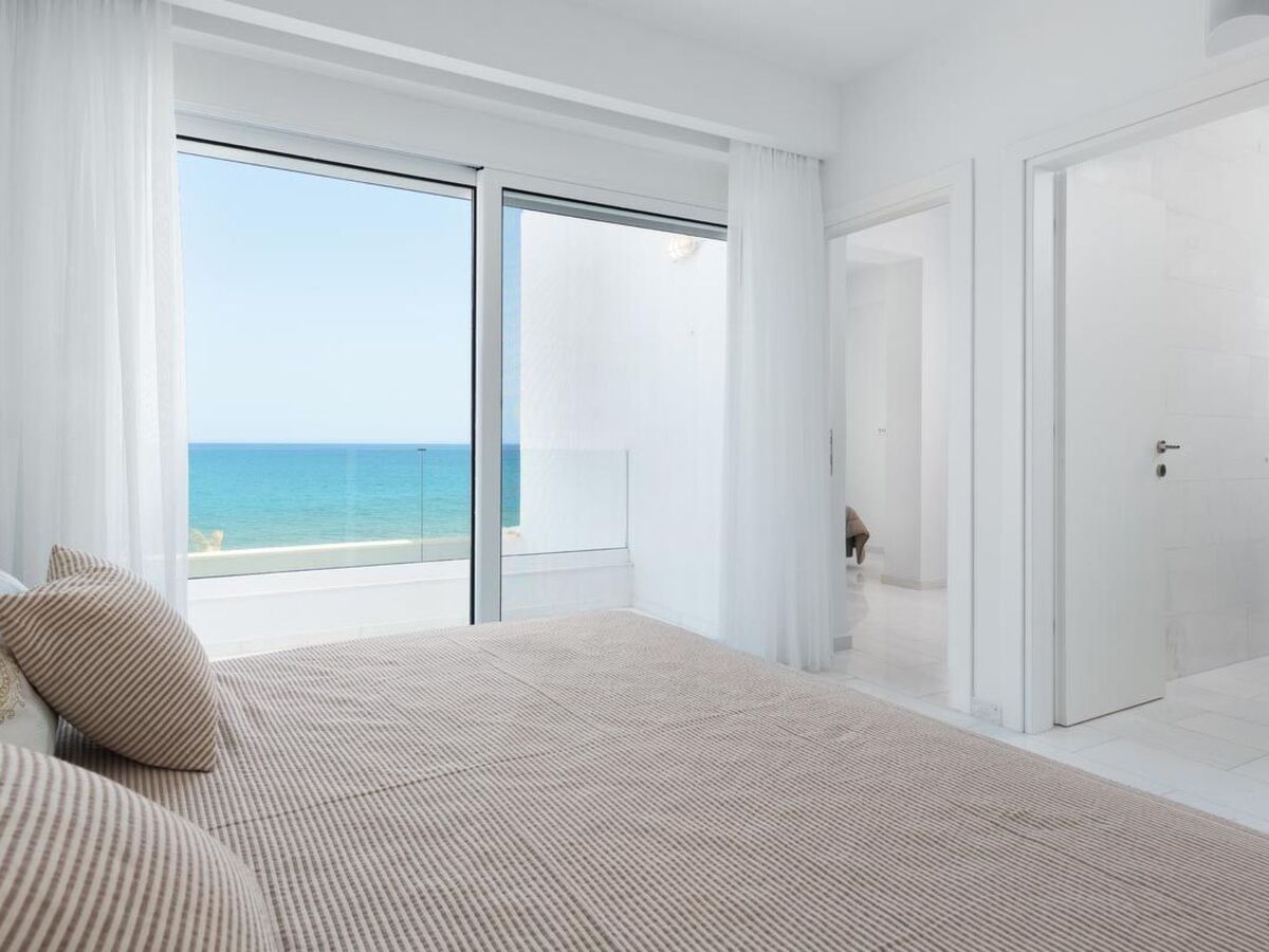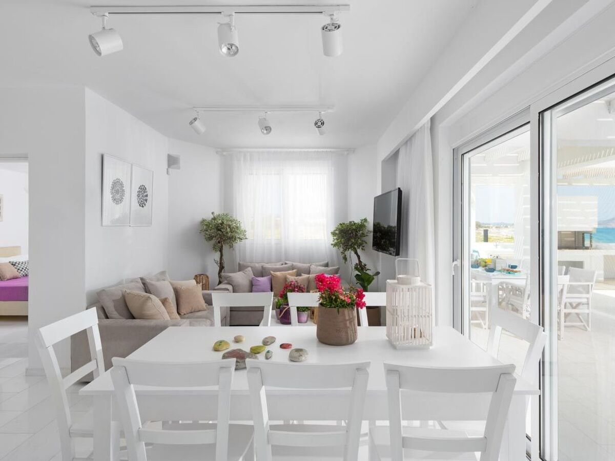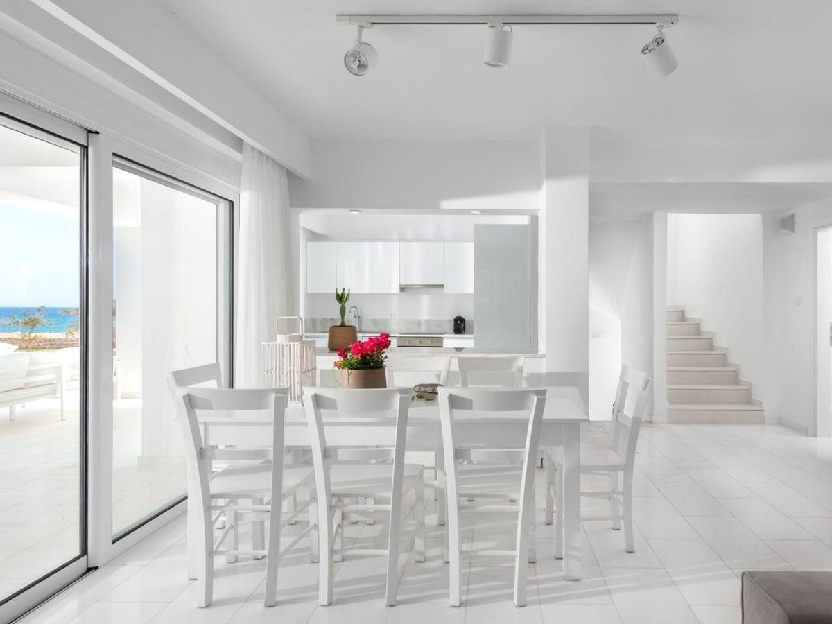 The combination of the colors, white and warm tones, fit perfectly with the exceptional window view of the sea and the pool.