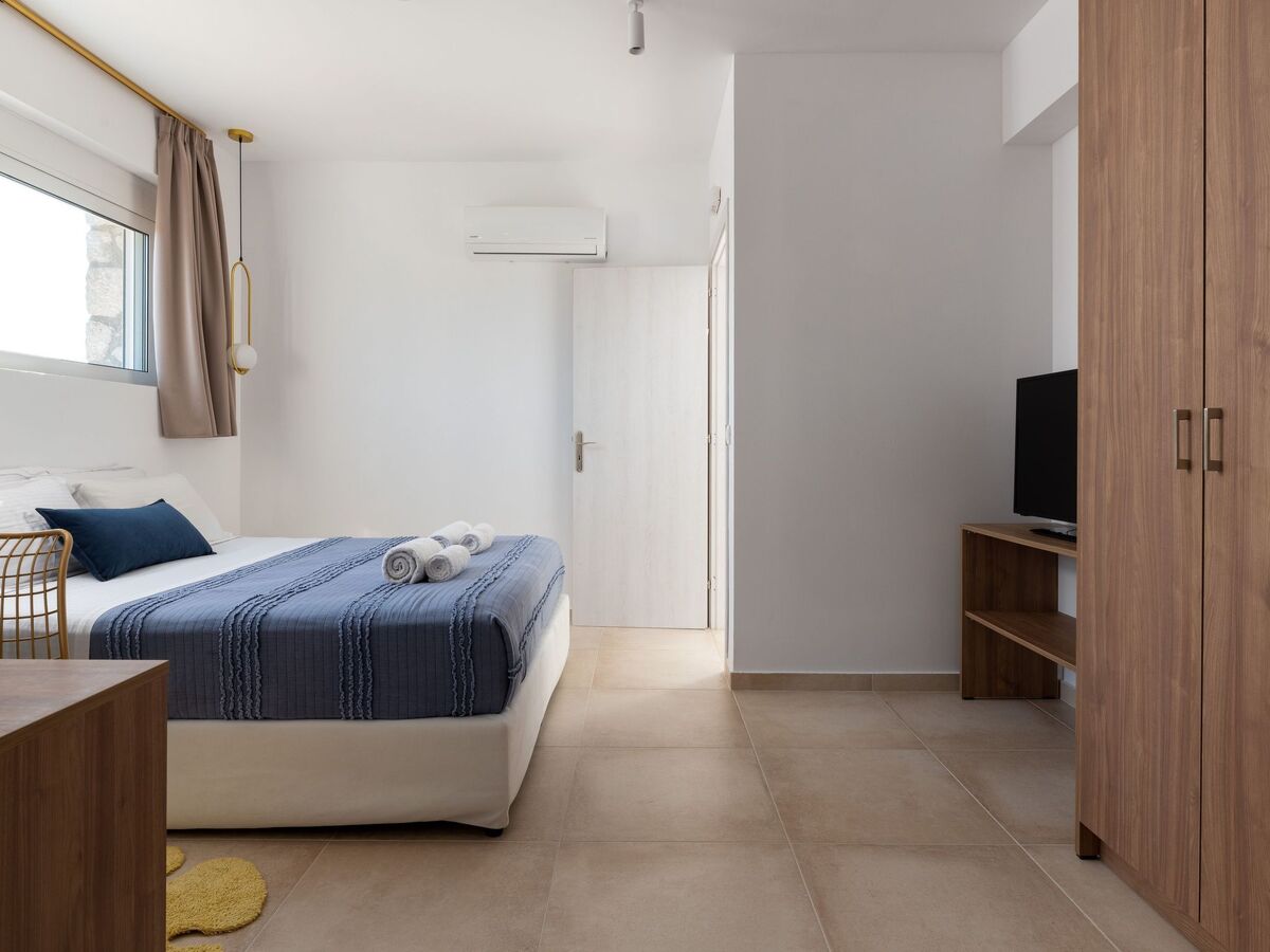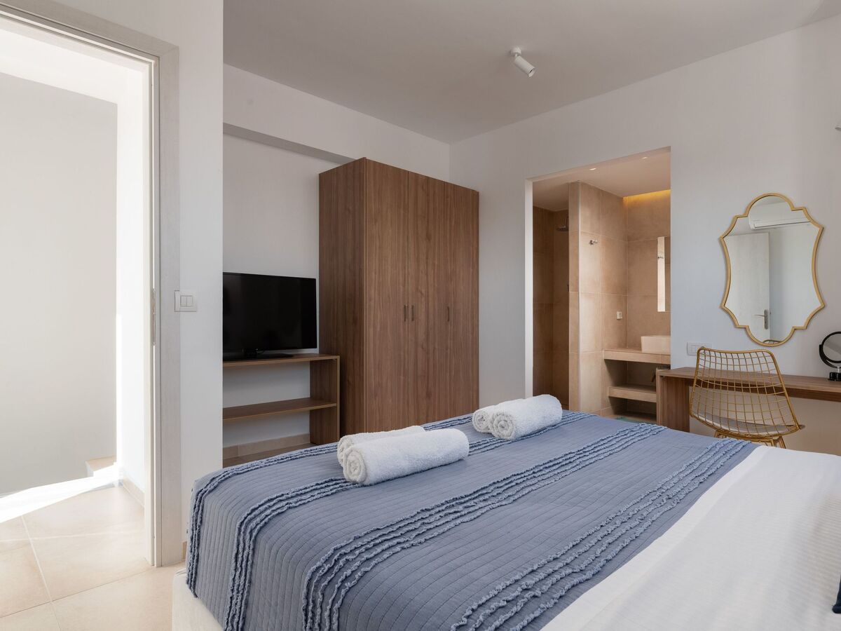 The master bedroom is en-suite with a TV and large balcony overlooking the pool.