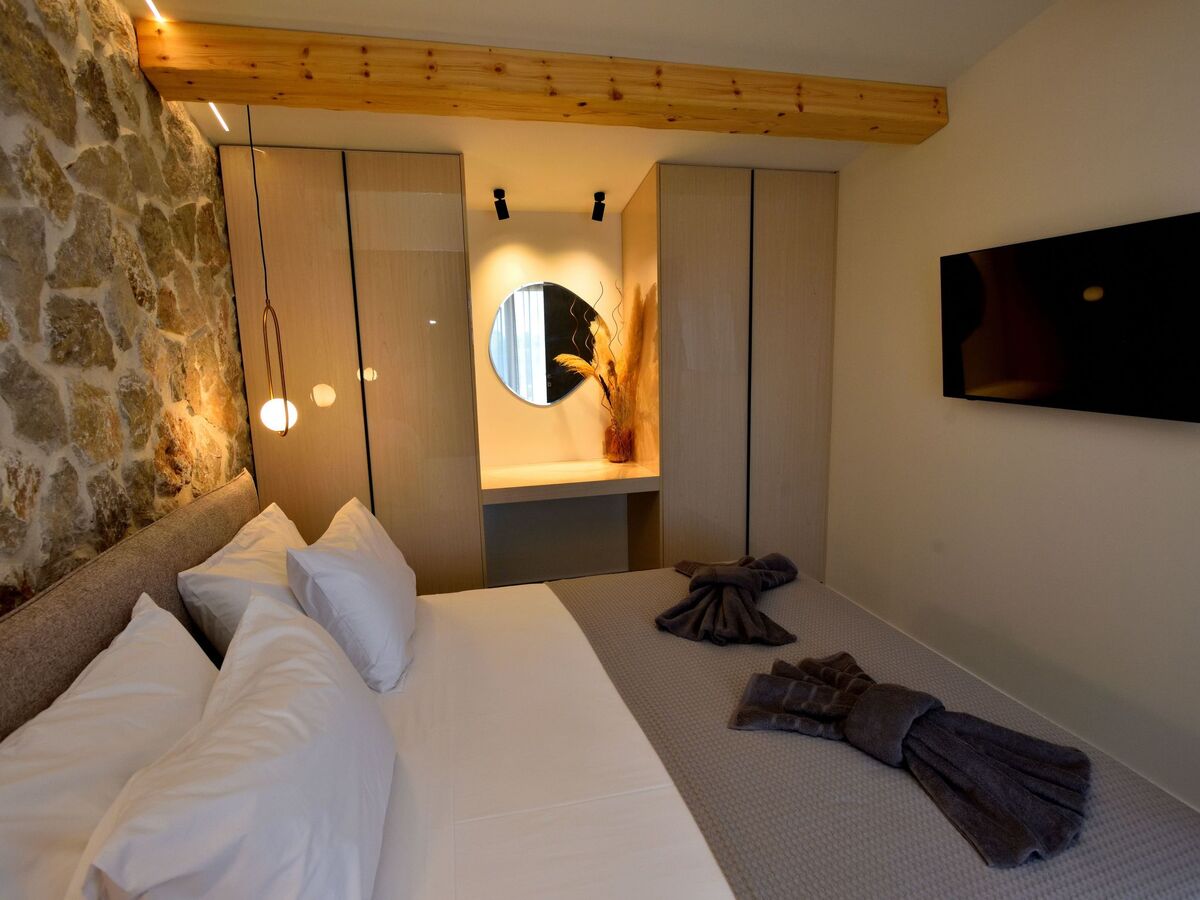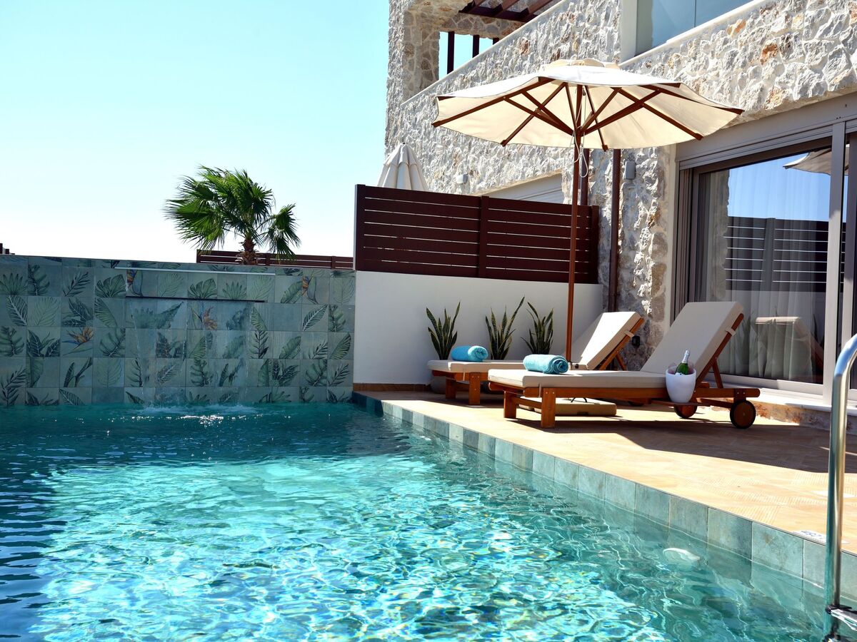 Outside, each maisonette has its own private pool with sun loungers, inviting you to relax under the Greek sun in complete tranquility.