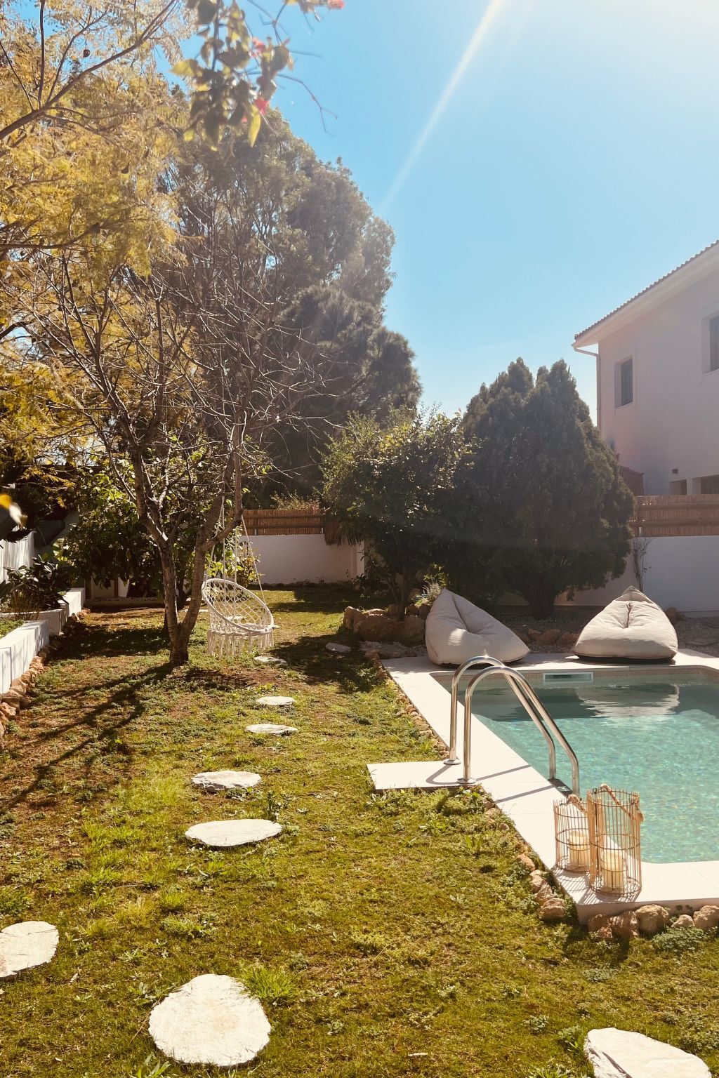A well-kept garden surrounds the pool area, offering a perfect spot for tranquil moments or playful gatherings.