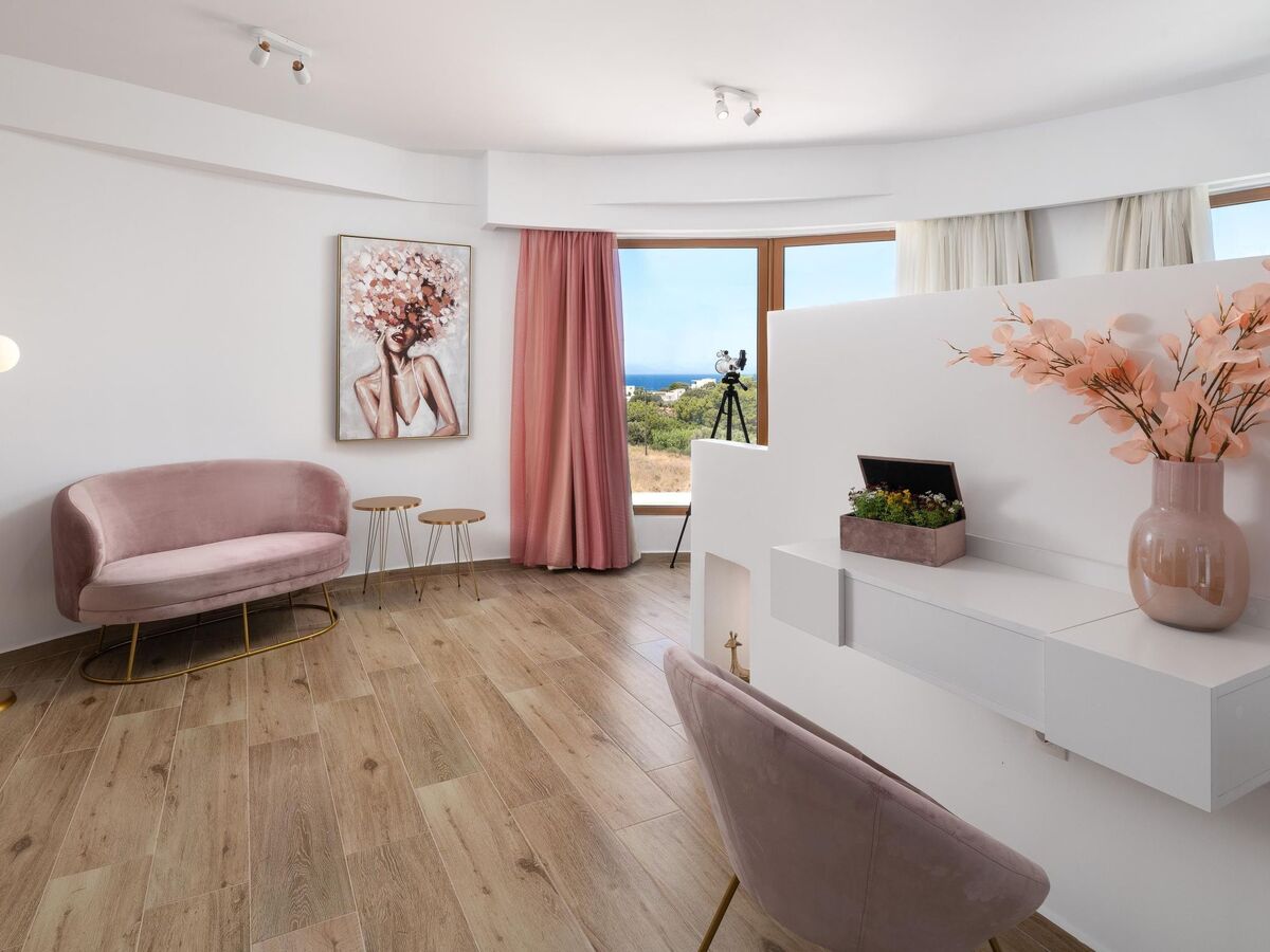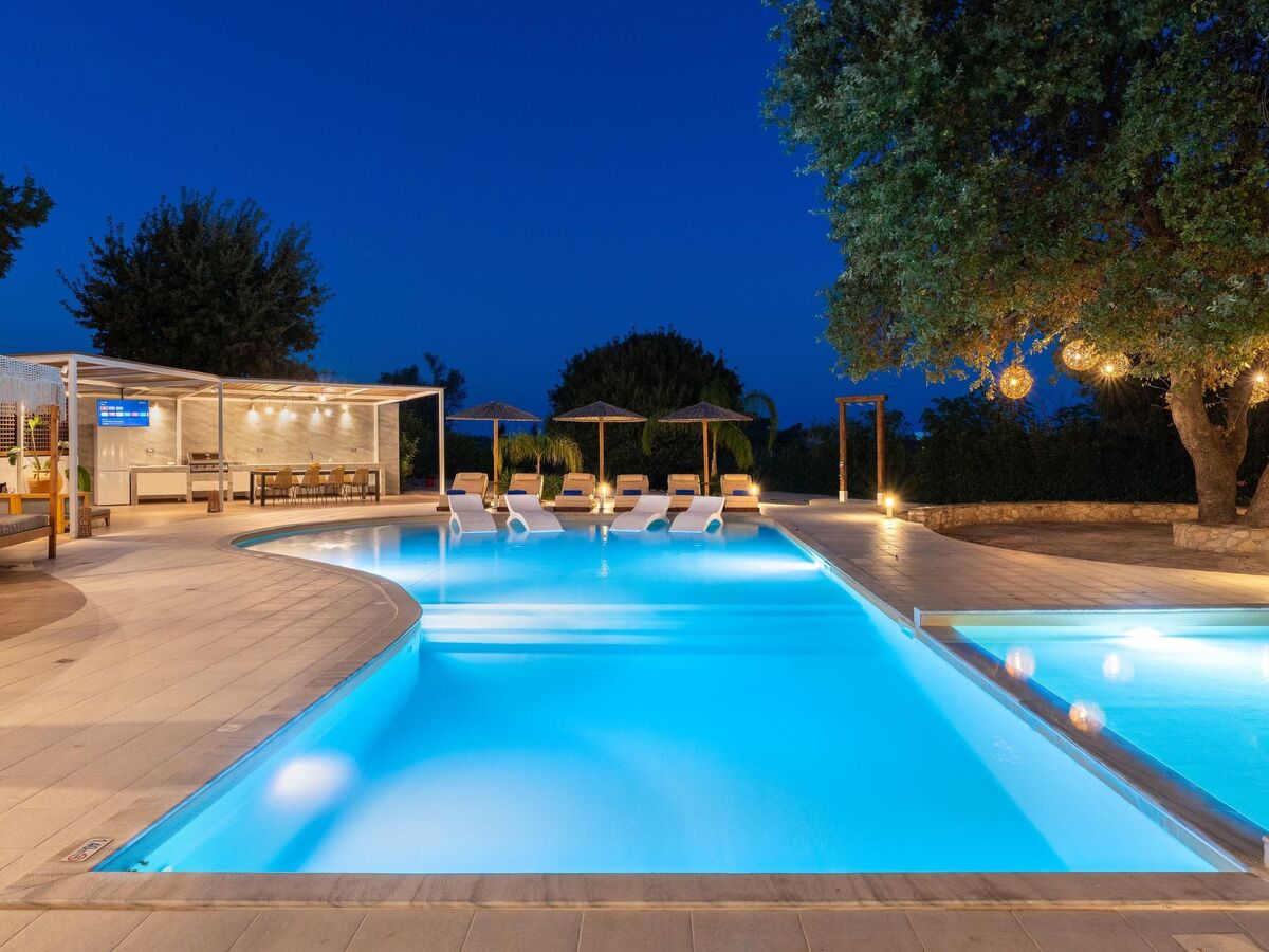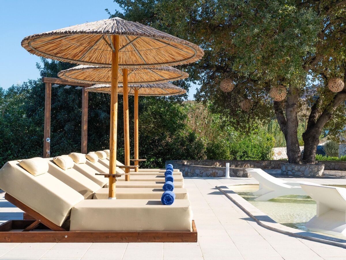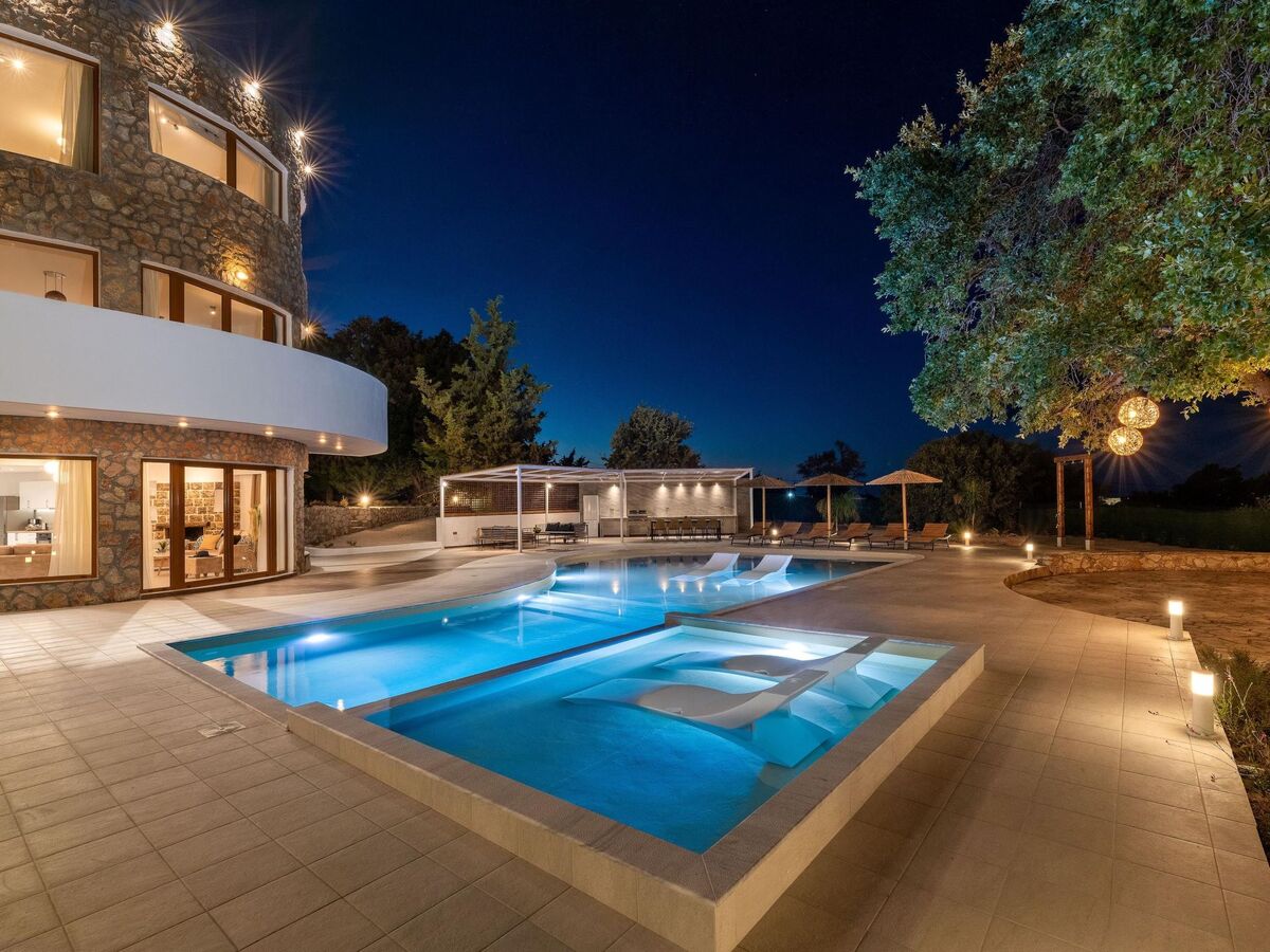 It offers large gardens surrounding the magnificent pool area and the heated jacuzzi that are equipped with parasols and floating sun beds, creating the perfect setting for a relaxed time under the golden rays of the Greek sun.