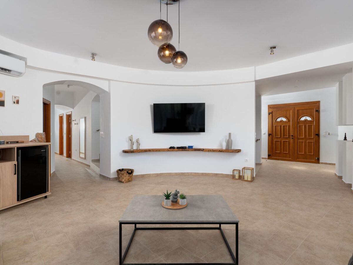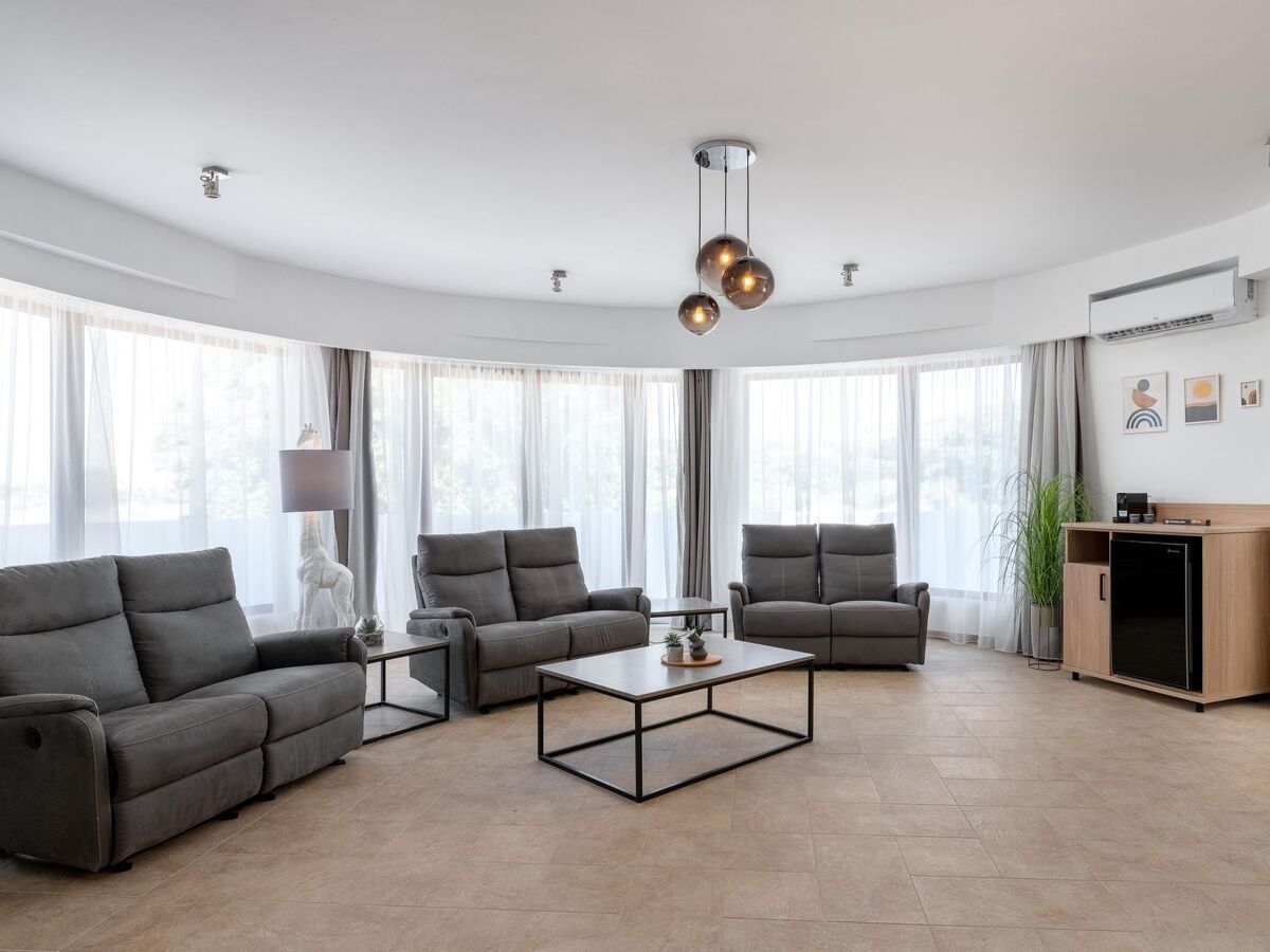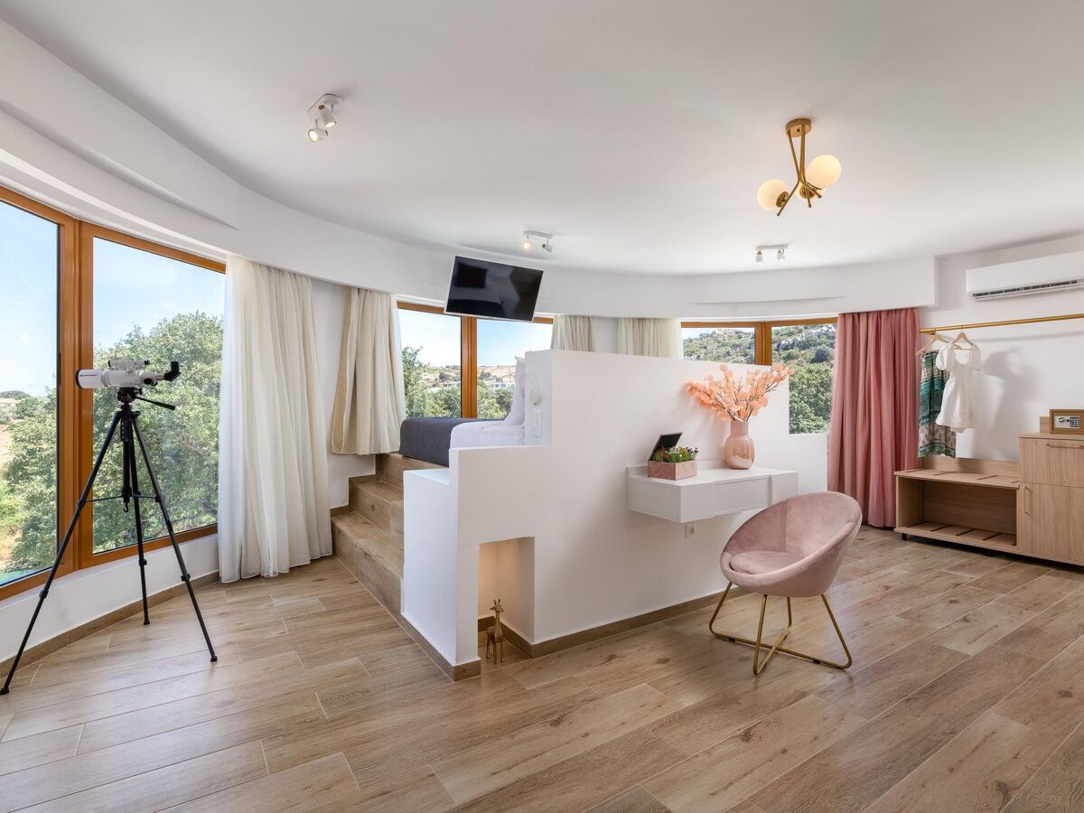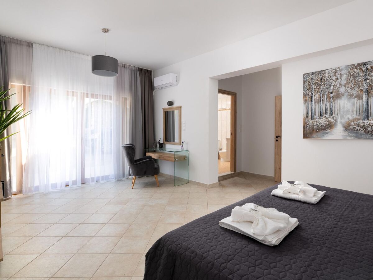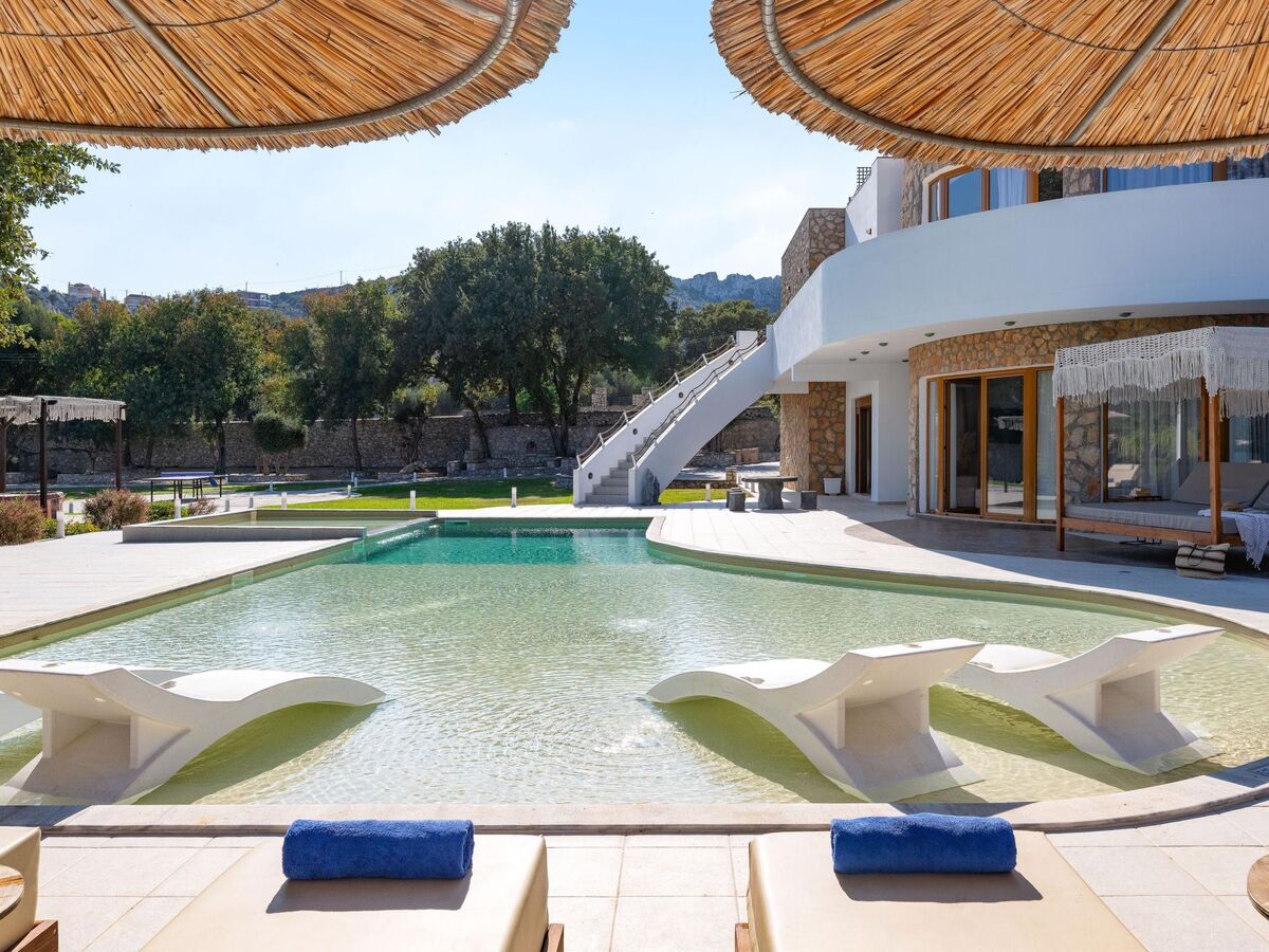 It offers large gardens surrounding the magnificent pool area and the heated jacuzzi that are equipped with parasols and floating sun beds, creating the perfect setting for a relaxed time under the golden rays of the Greek sun.