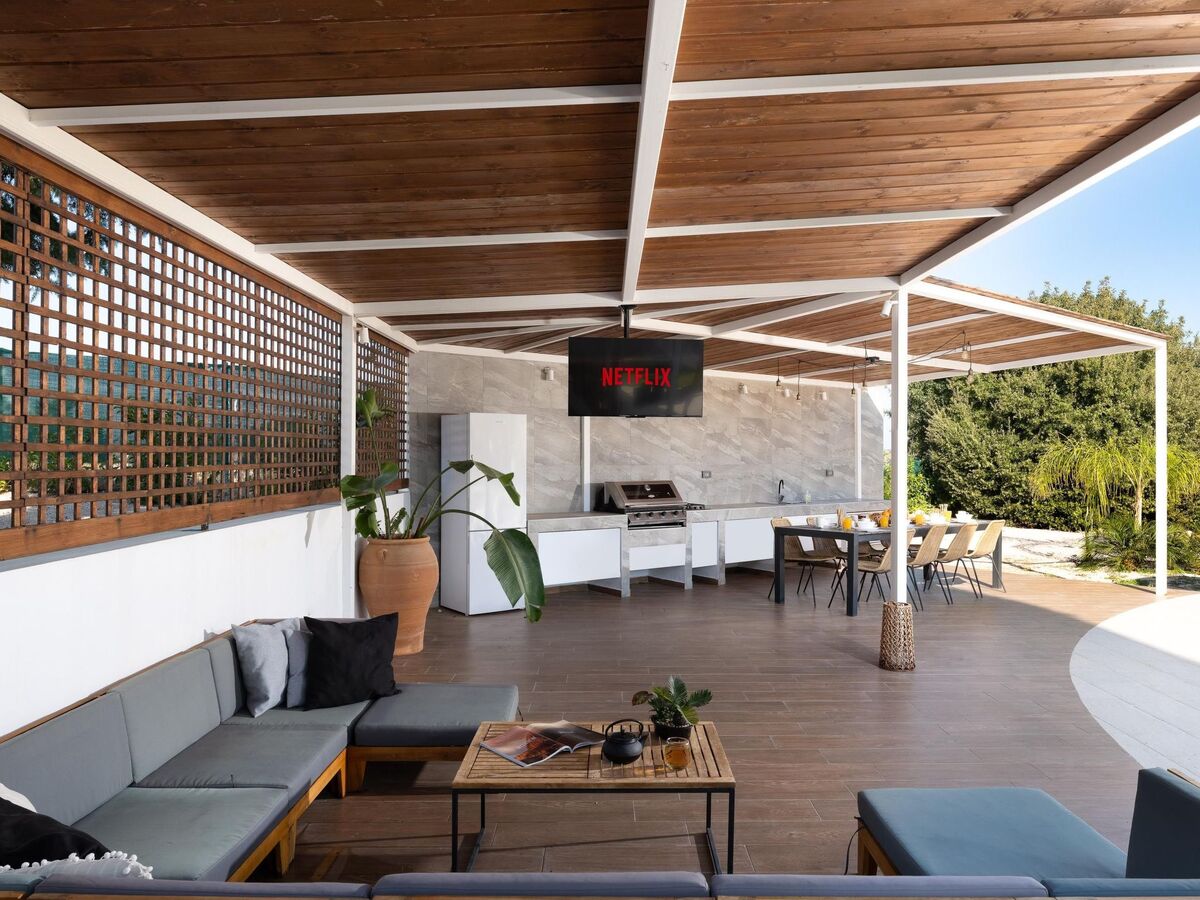 The villa offers an outdoor fully equipped kitchen with an incredible BBQ installation and furnished areas in the garden, where guests can enjoy a truly unique outdoor gathering.